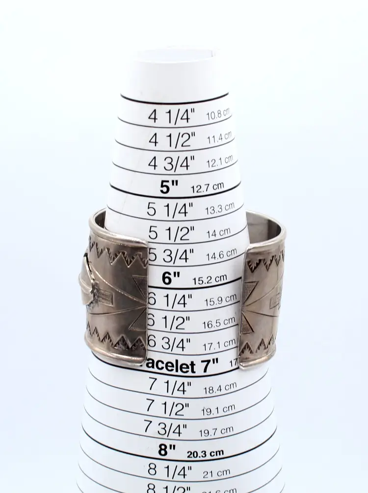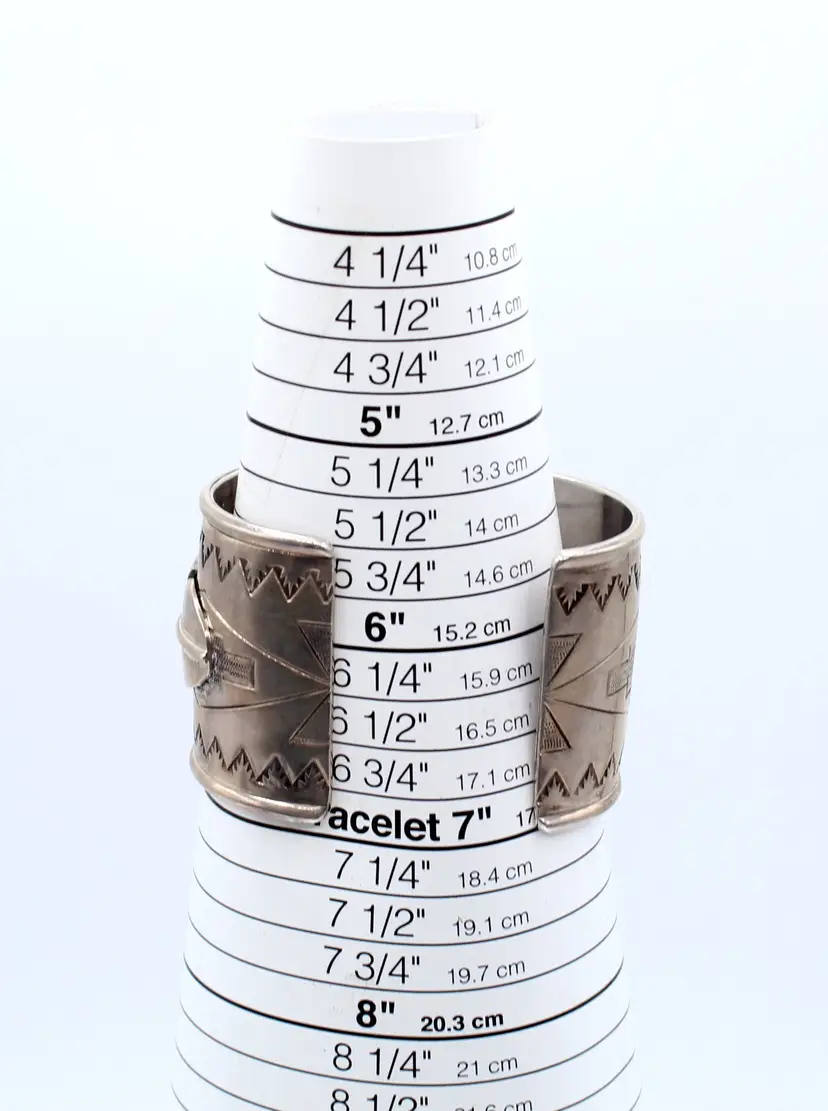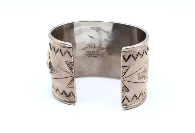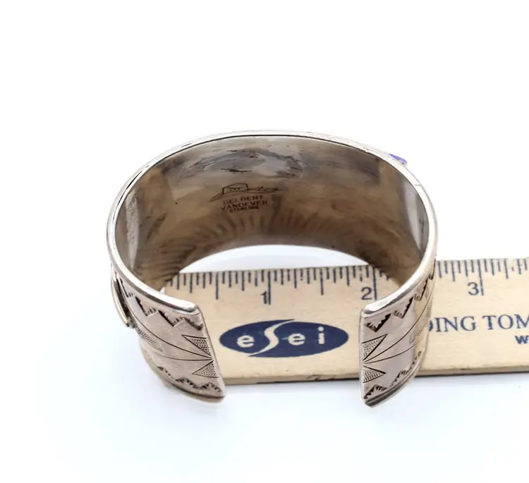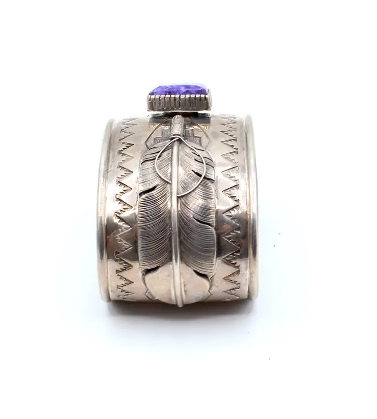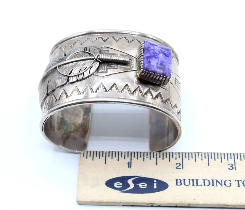 Award winner Delbert Vandever Navajo. Stunning hand stamped tepee edge and southwest motif design, leaf accent and a Charoite square stone in a hand cut bezel. Stamped with Delbert Vandever with the hat pico over his name. Inner diameter 5.5", gap 1.25", 1.75" wide.