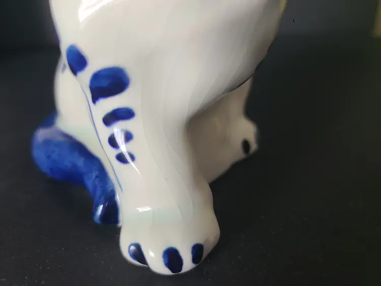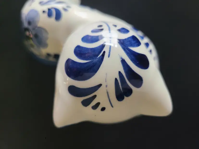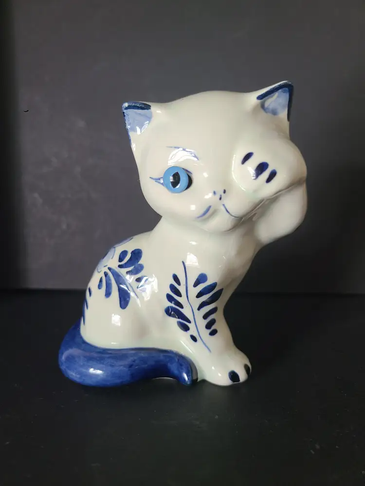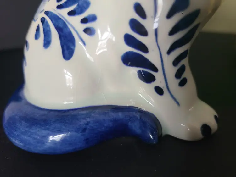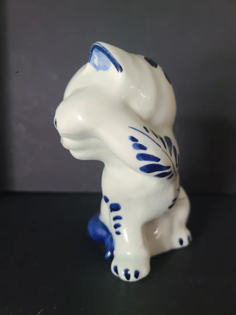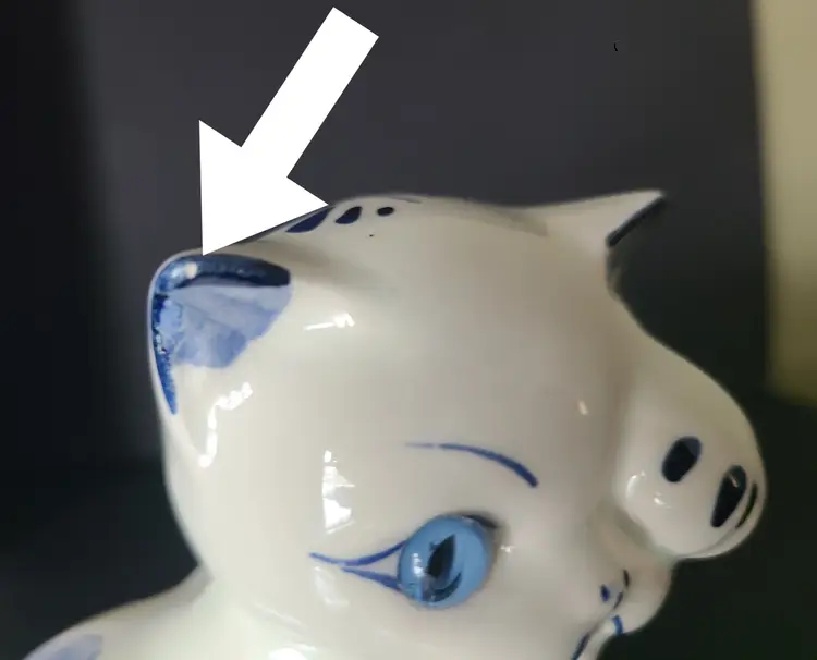 Kitty is 4" tall. No cracks. One tiny chip on her ear, as shown in pic. Significant crazing. Quite darling, nonetheless.
