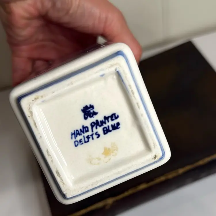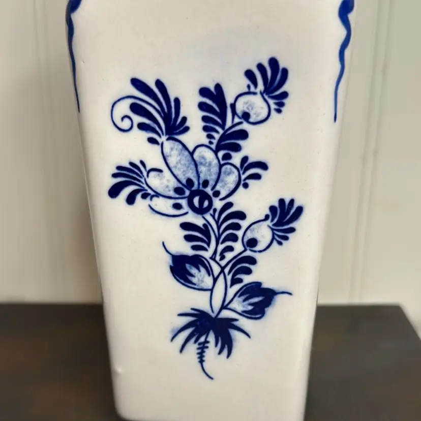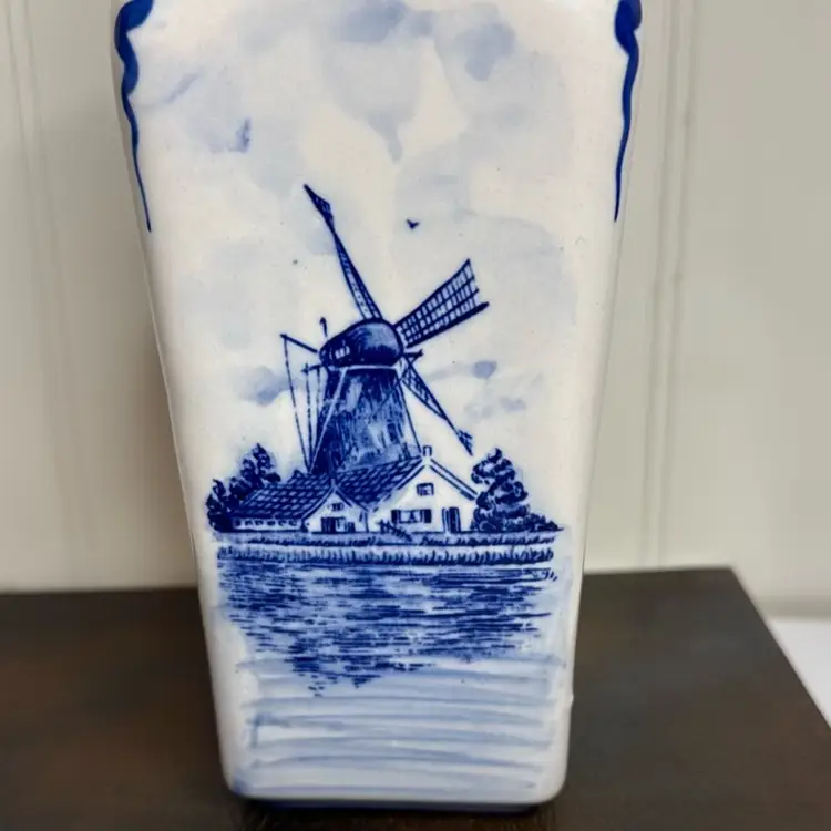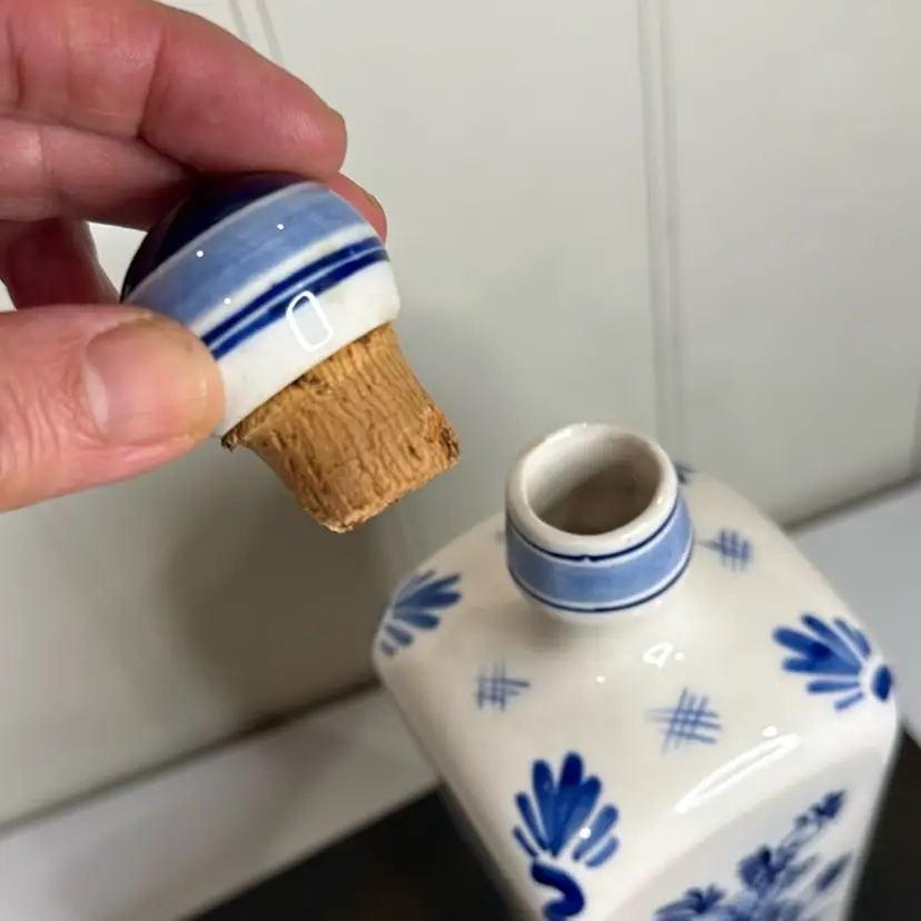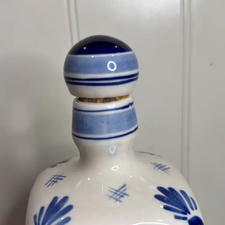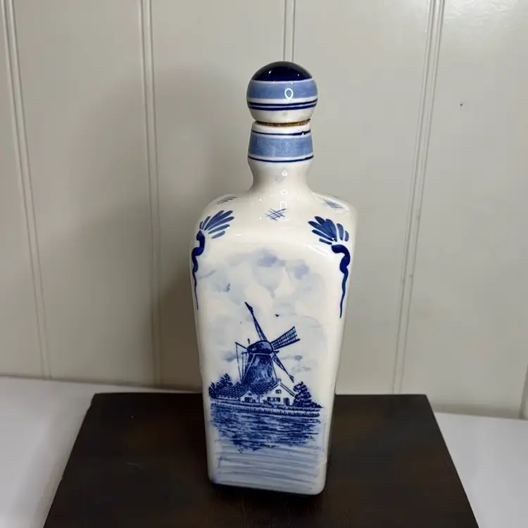 Windmill and flower design. Cork top doesn’t fit exact in bottle. No chips or cracks. 8.5” tall, 3” wide.