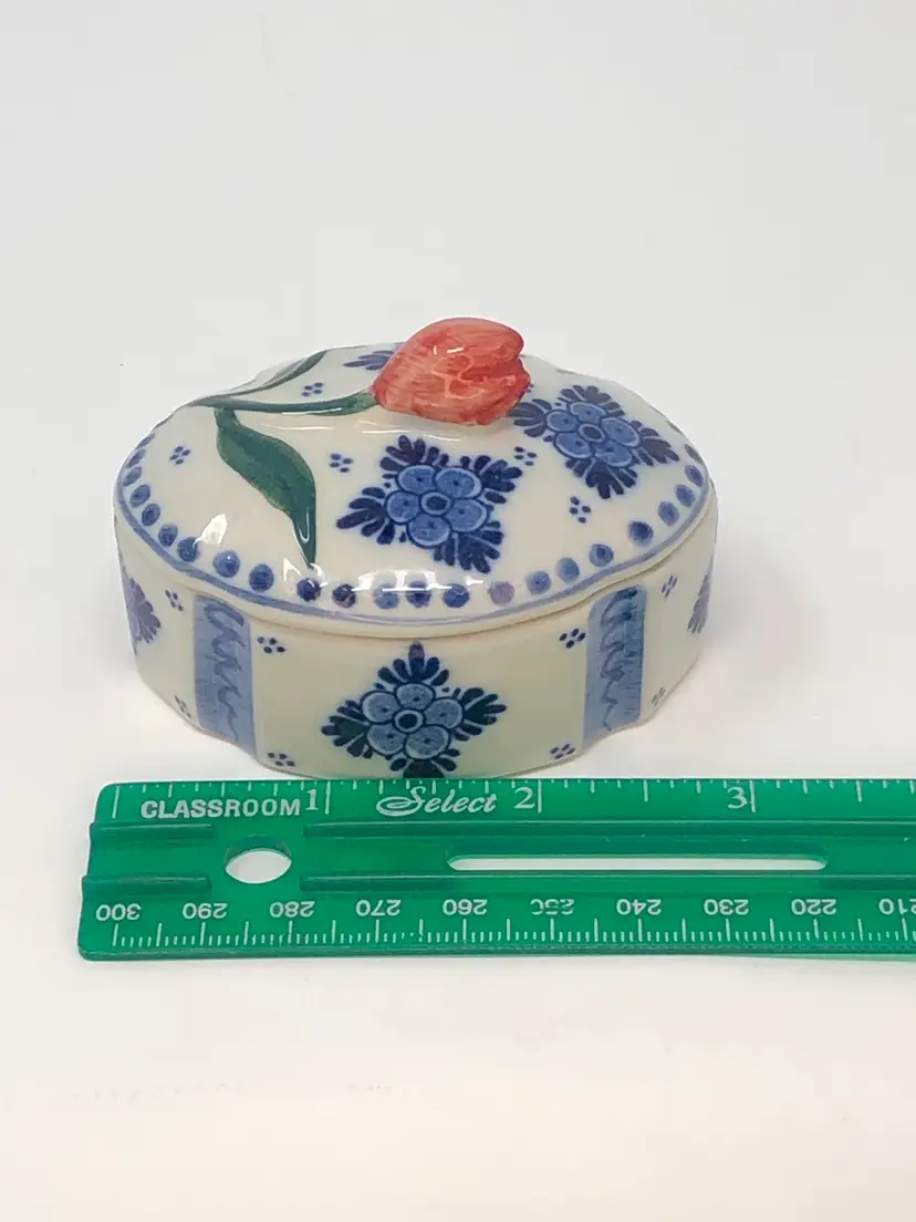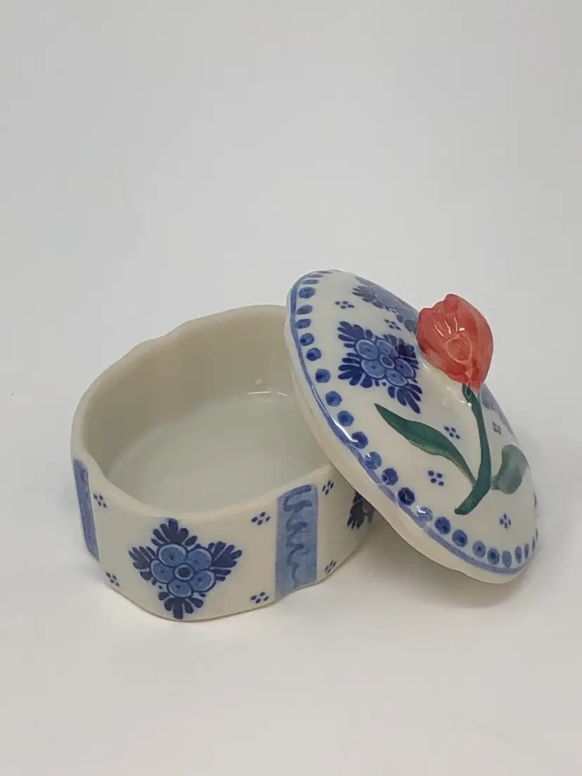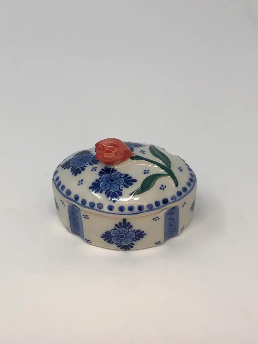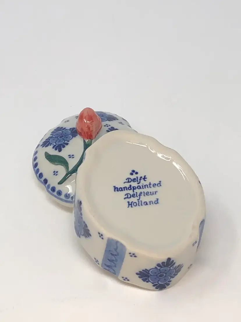 So spot-on! This piece pairs the classic Delft blue with the signature Holland red tulip and creates a real treasure! Interesting design includes evenly spaced, accented indentations in the lid and box. Less than 2 inches tall and 3 inches long and in excellent condition, as shown in photos.