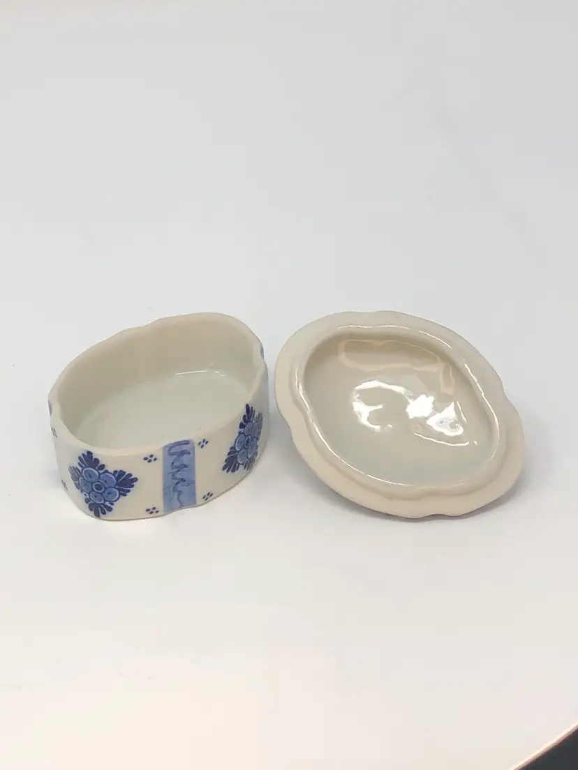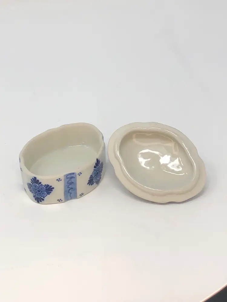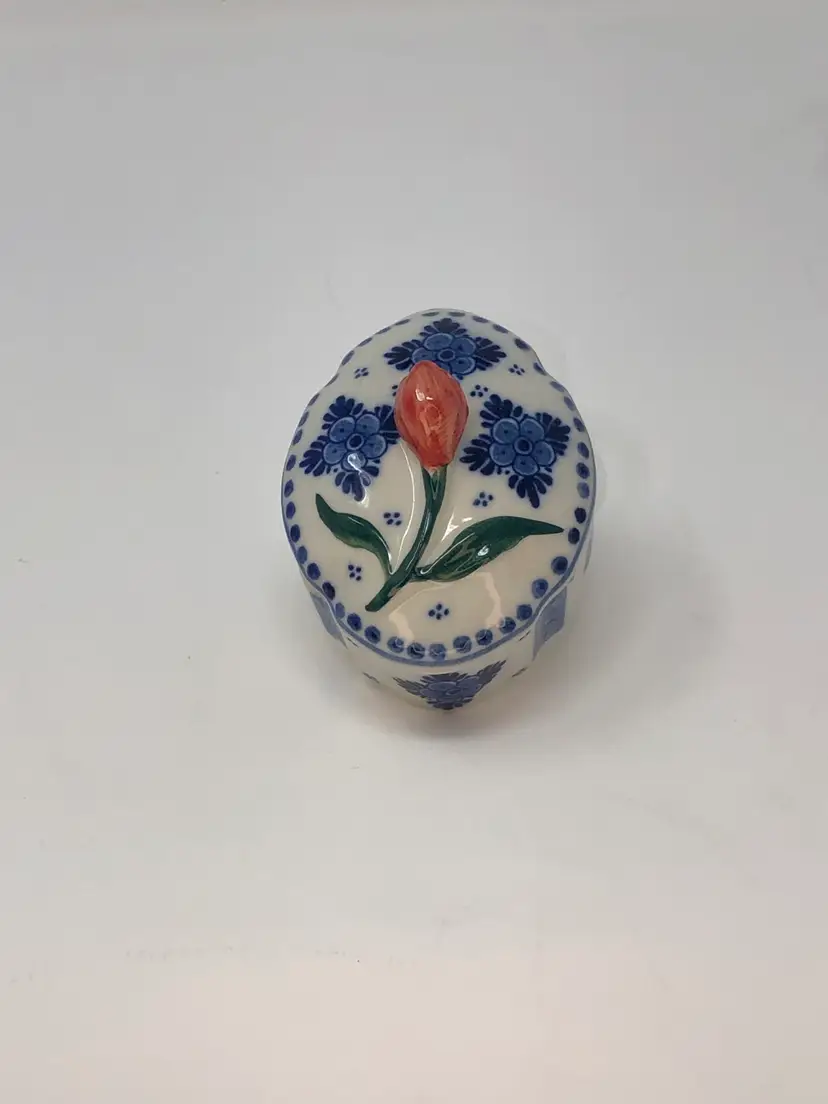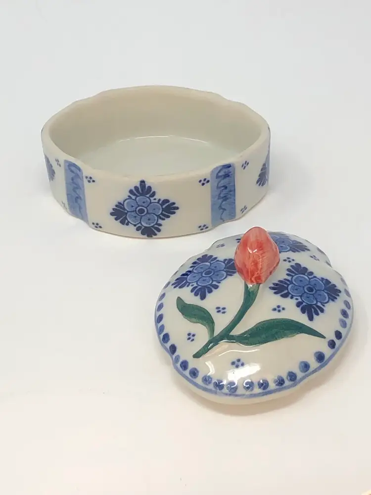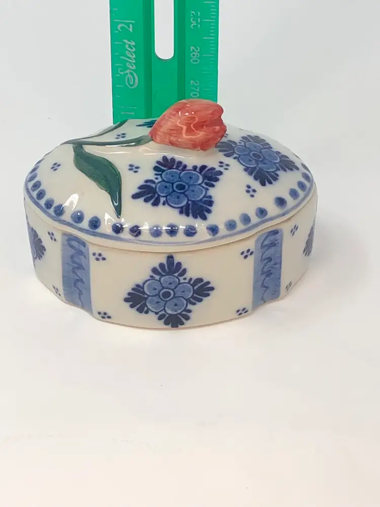 So spot-on! This piece pairs the classic Delft blue with the signature Holland red tulip and creates a real treasure! Interesting design includes evenly spaced, accented indentations in the lid and box. Less than 2 inches tall and 3 inches long and in excellent condition, as shown in photos.