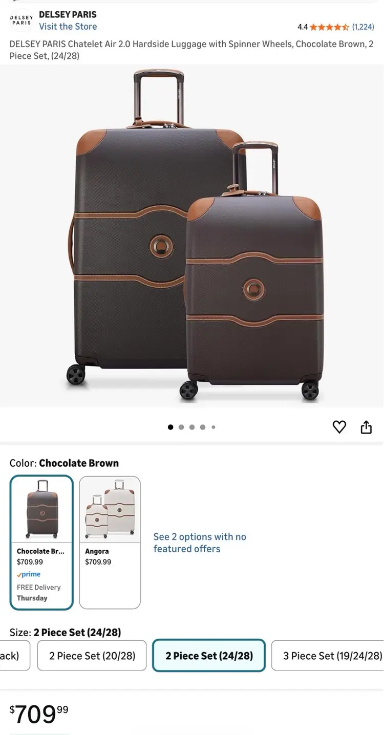 Product specifications Features & Specs Wheel Type Spinner Number of wheels 8 Lock Type Combination Lock Capacity 44 Liters Handle Type Carrying Handle Strap Type Stretchable Water Resistance Level Water Resistant Number of Handles 3 Number of Sections 2 Number Of Pockets 14 Measurements Size 2 Piece Set (24/28) Item Dimensions L x W x H 20.75"L x 12.75"W x 30"H Item Weight 20.2 Pounds Storage Volume 179 Liters Item details Brand Name DELSEY PARIS Manufacturer Delsey Luggage, Inc. UPC 098376068250 Item Type Name Luggage- Luggage Set Manufacturer Warranty Description 10 Year Manufacturer's Warranty Best Sellers Rank #35,958 in Clothing, Shoes & Jewelry (See Top 100 in Clothing, Shoes & Jewelry) #237 in Luggage Sets ASIN B0B5B727V1 Customer Reviews 4.4 out of 5 stars 1,224Reviews Style Color Chocolate Brown Pattern Solid Subject Character Chatelet Materials & Care Material Type Polycarbonate (PC) Shell Type Hard