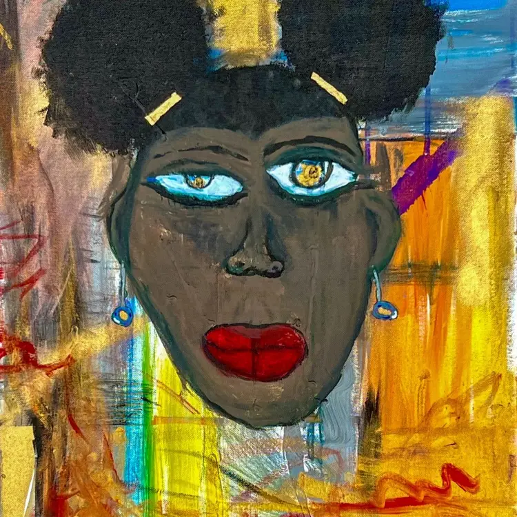 A vibrant portrait stands out with stark contrasts, featuring a face with large blue eyes and full red lips against a backdrop of dynamic, colorful brushstrokes. The subject's hair is styled in two buns secured with yellow pins while she dons blue earrings that complement her striking eyes.