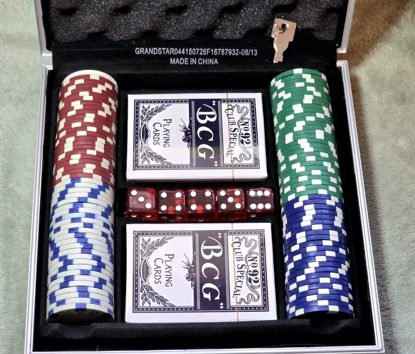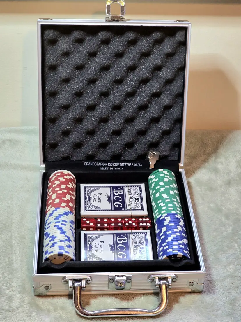“New”-Excellent Condition Deluxe Set Includes: 100 Poker Chips (10.5 gram) & Dealer Button 2 Decks of Playing Cards 5 Dice Aluminum Carrying Case (with lock) Original Owner Please View Photos to see Condition & Contents of this Item No Refunds or Cancellations Thanks for Visiting!!