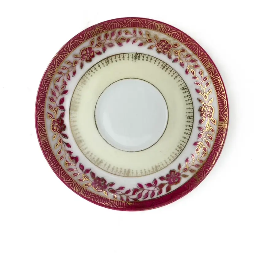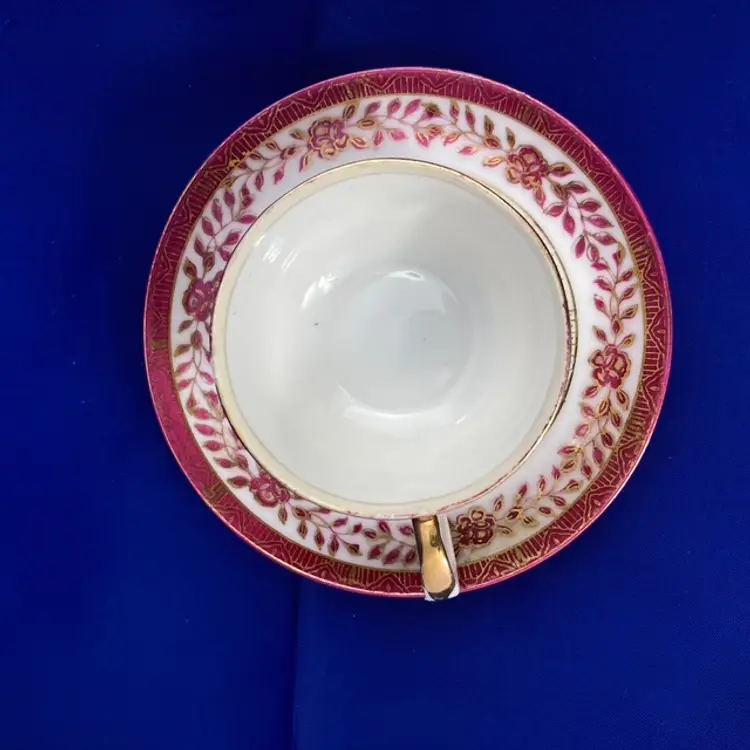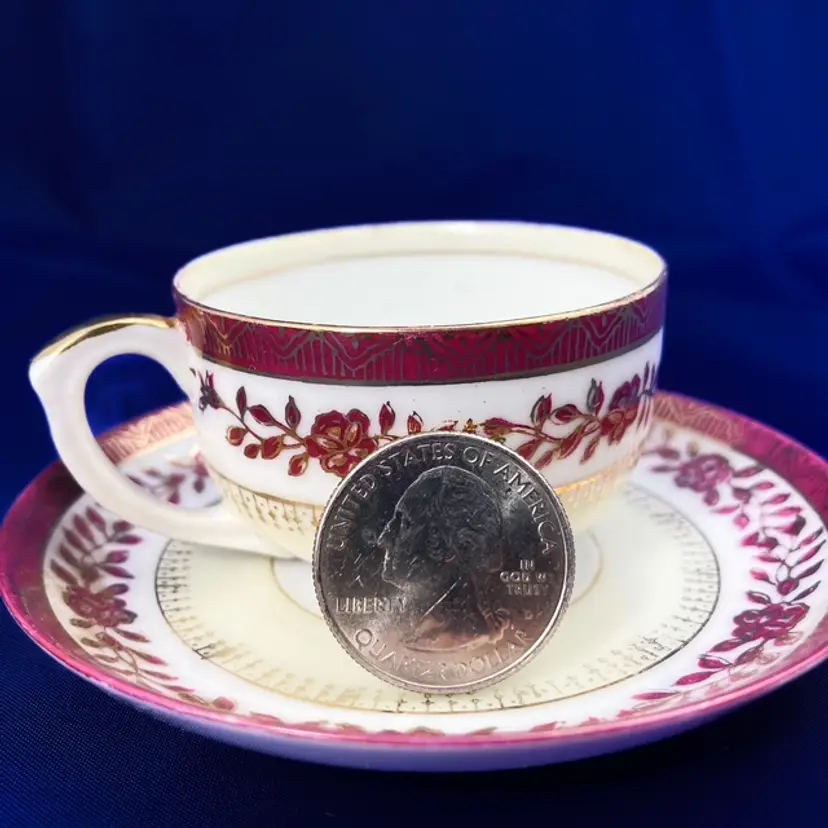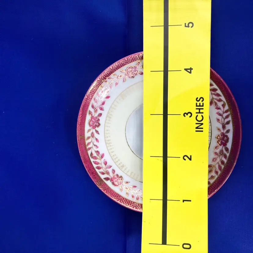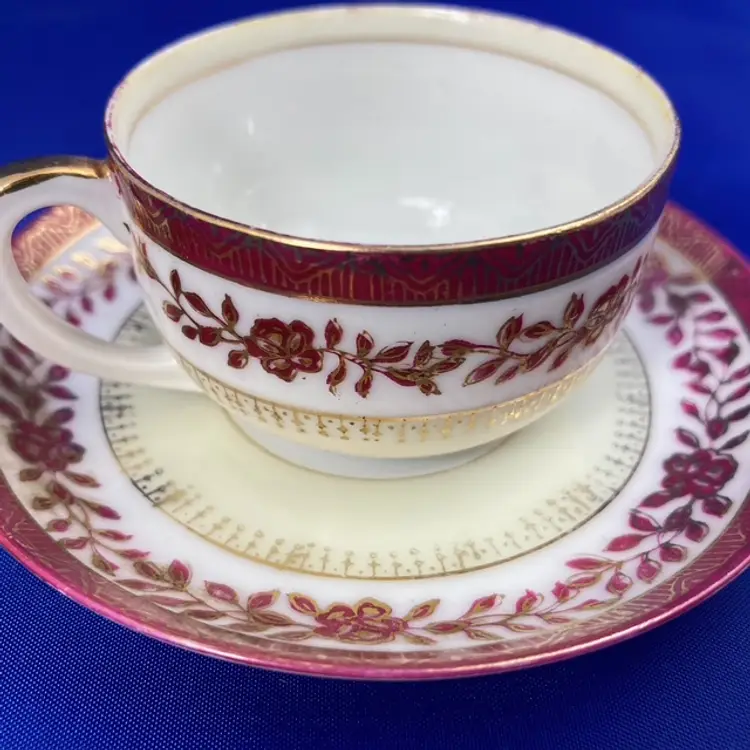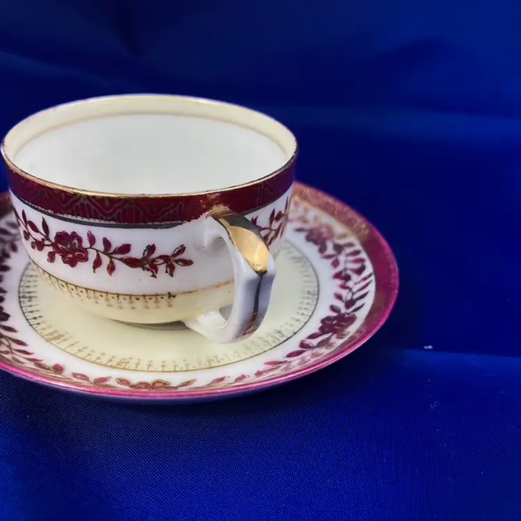 Hand Painted with gilded designs, this vintage cup measures 1/5" tall and the matching saucer is 2.25" across. Pre-owned in very good condition- no chips or cracks. Please note, hand crafted items may have dimples, roughs and/or fine scratches. mart92