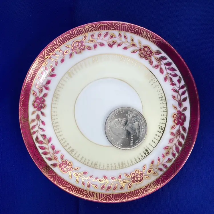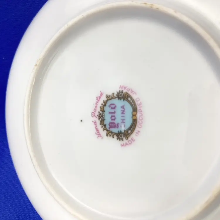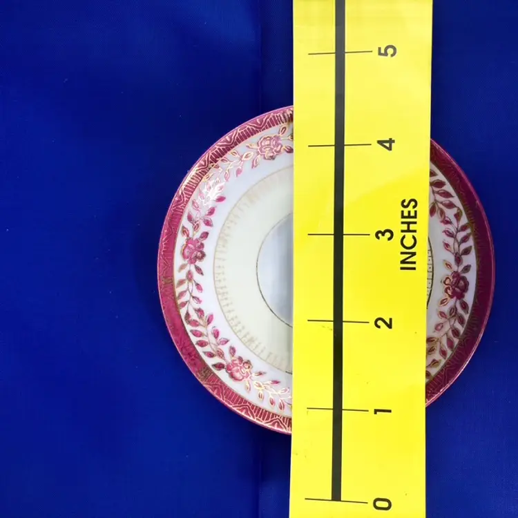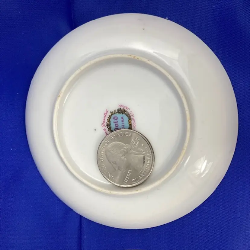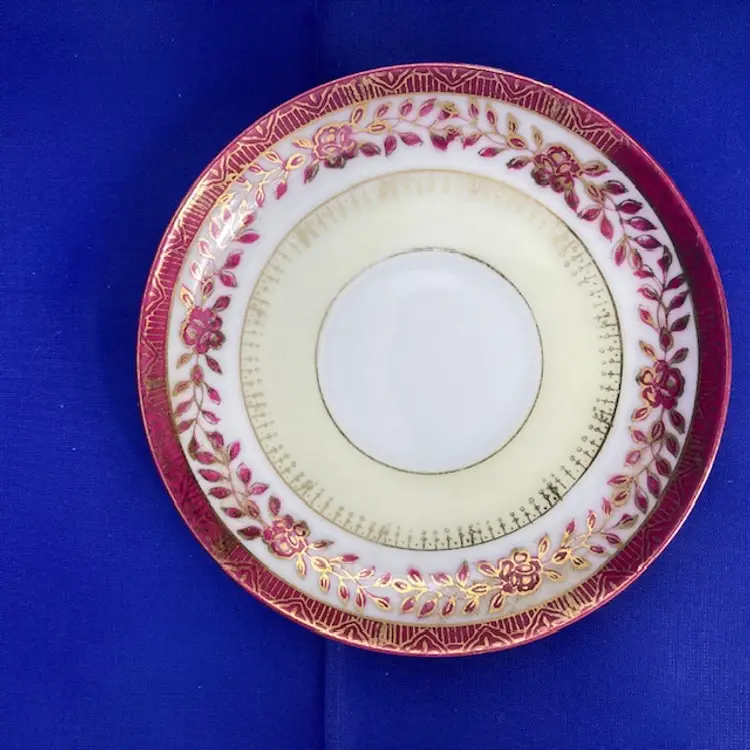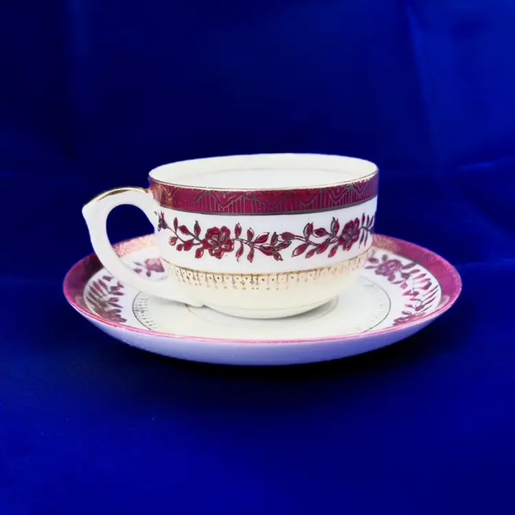 Hand Painted with gilded designs, this vintage cup measures 1/5" tall and the matching saucer is 2.25" across. Pre-owned in very good condition- no chips or cracks. Please note, hand crafted items may have dimples, roughs and/or fine scratches. mart92