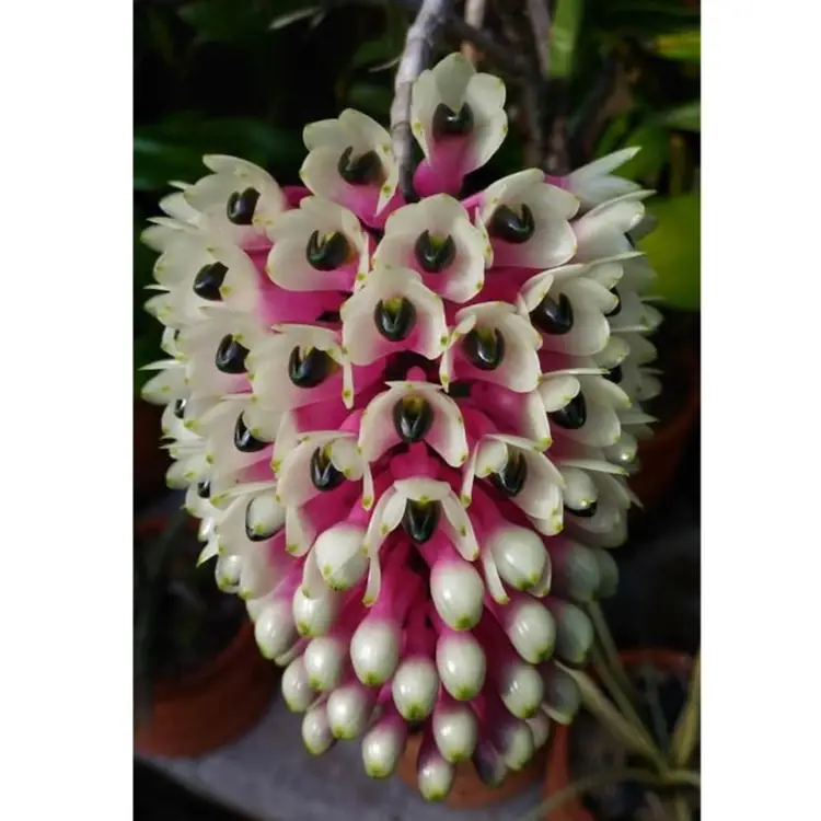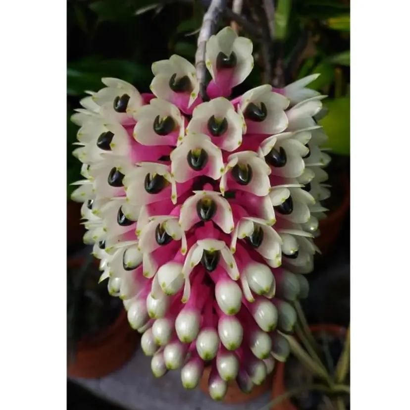 This is a unique species orchid with an amazing inflorescence of white, pink, and green blooms. These are well into blooming size and will bloom next spring/summer.