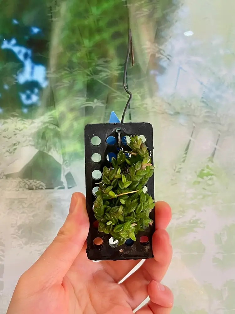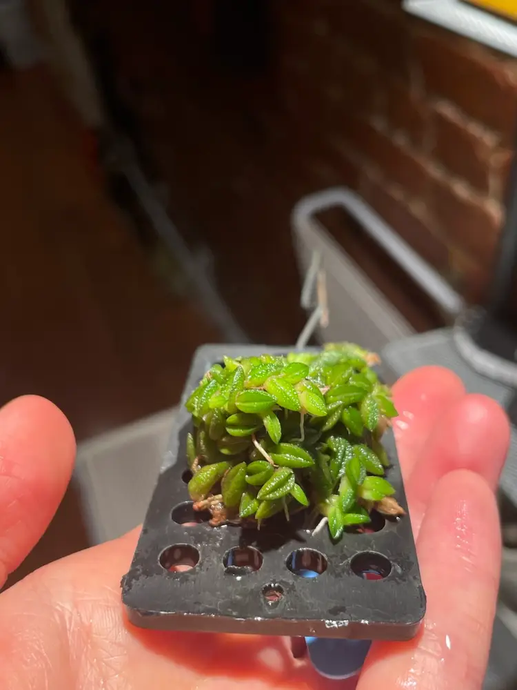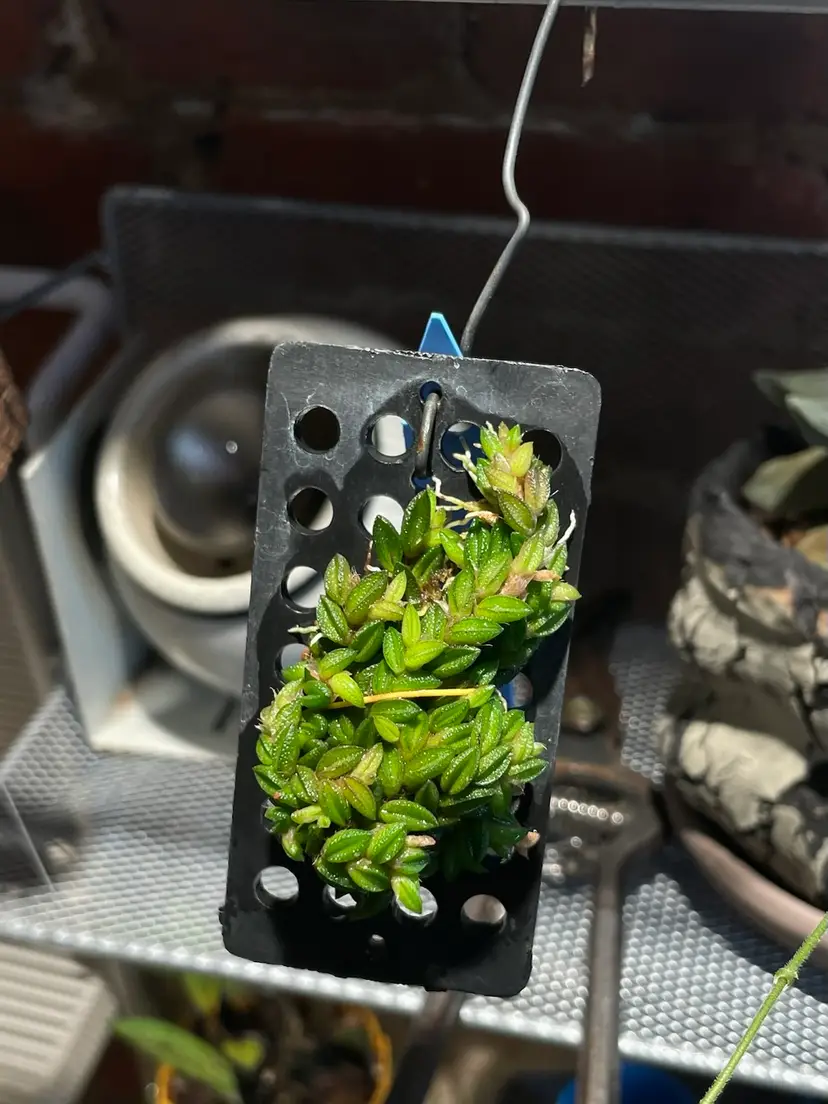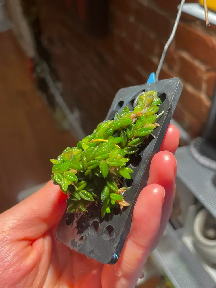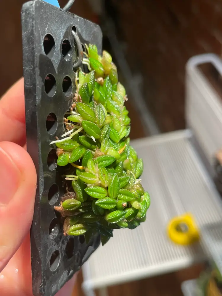 It’s the tiniest of the mini Dendrobiums, and possibly all orchids, this mini would fit into any collection, even a thimble, sparkling wheat-grain like leaves (1/5) closely alternate on a freely branching rhizome, each leaf bears a single 1/8 bloom that lies on the leaf, the long lasting flowers are translucent yellow with a three lobed yellow lip with red markings