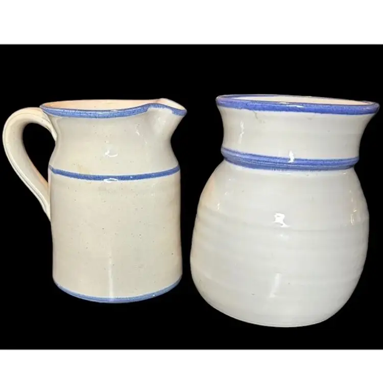 Pitcher made in 1988 and measures 5” tall; crock made in 1989 and measures 5.5” tall.