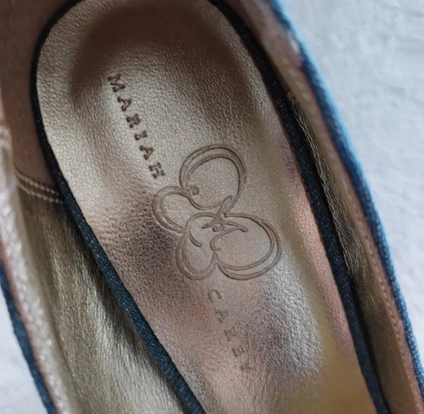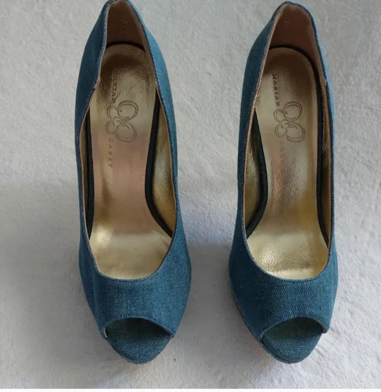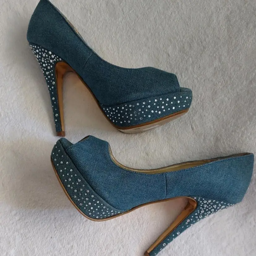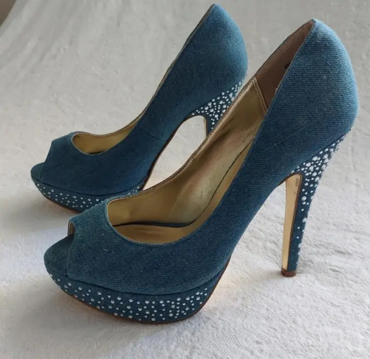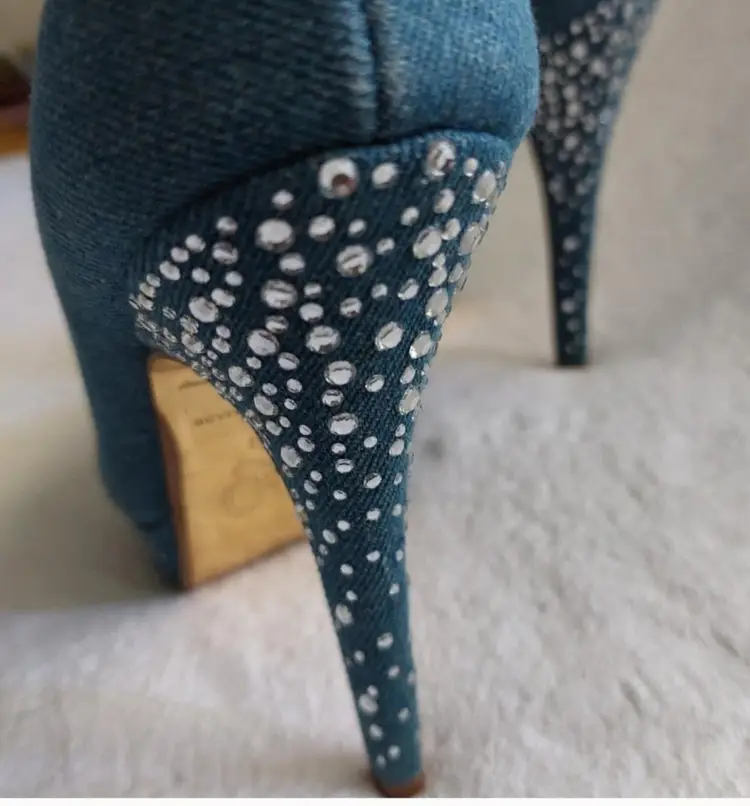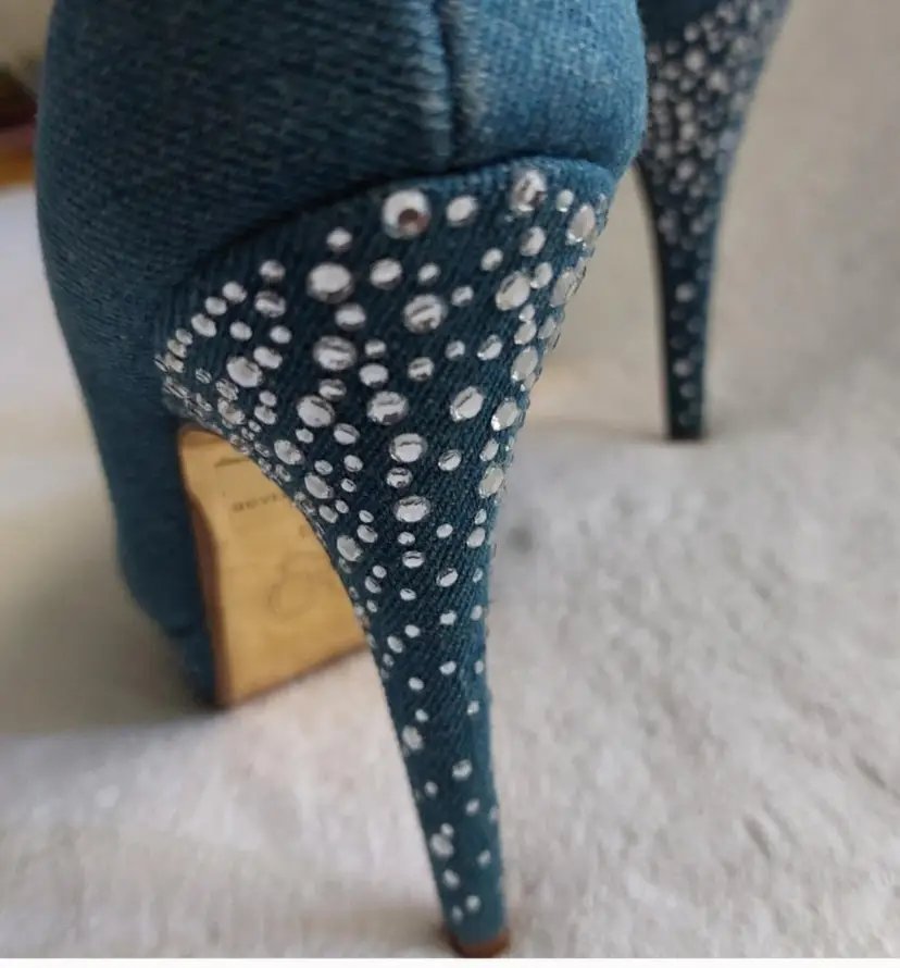 MIRIAH CAREY VINTAGE 90S.Y2K RETRO DENIM SPARKLE RHINESTONE HEEL STILETTO,SMALL AREA ON THE HEEL DISCOLORATION NOT VERY VISIBLE ,VERY GOOD PREOWNED CONDITION SIZE 7M