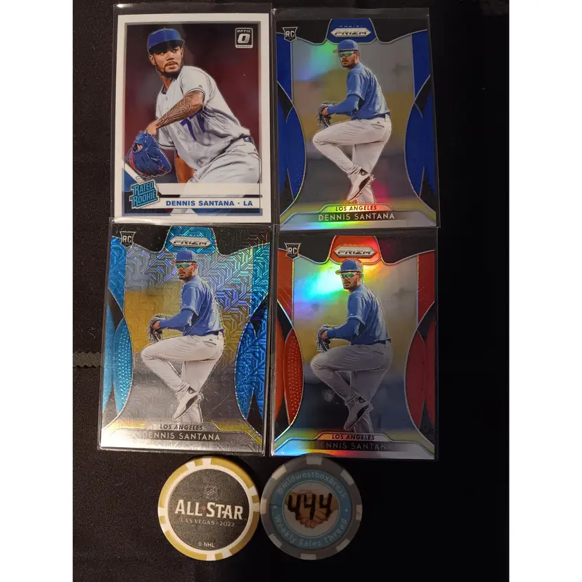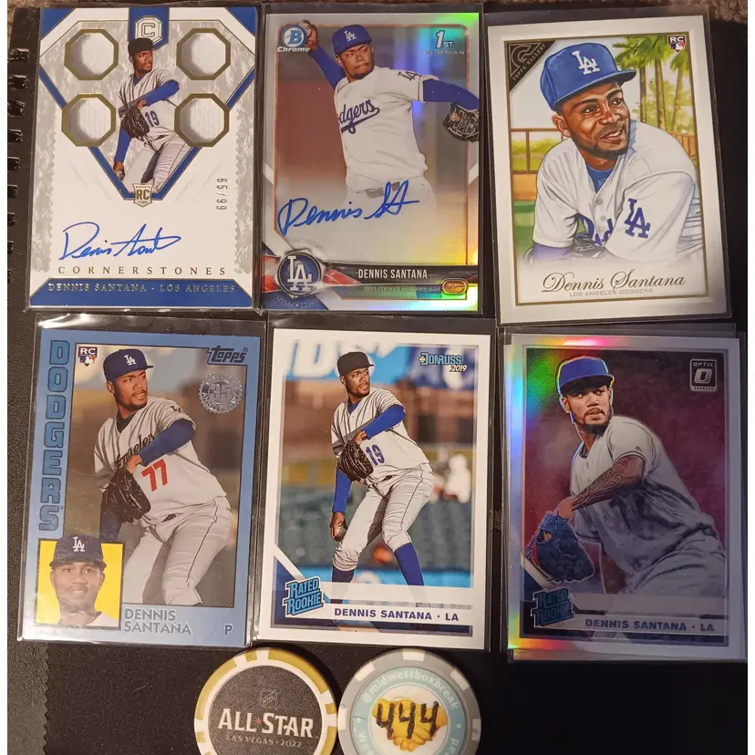 An RC lot of free agent pitcher Dennis Santana including a Cornerstones quad-patch relic auto /99, a 1st Bowman Chrome auto /499 and several other RCs.