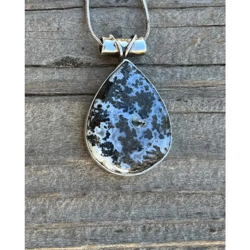 A Beautiful Dentritic Agate Necklace. 925 Sterling Silver. The Pendant Measures approximately 1 1/2 inches long and 1 inch wide. On a 18 inch Sterling Silver Chain.