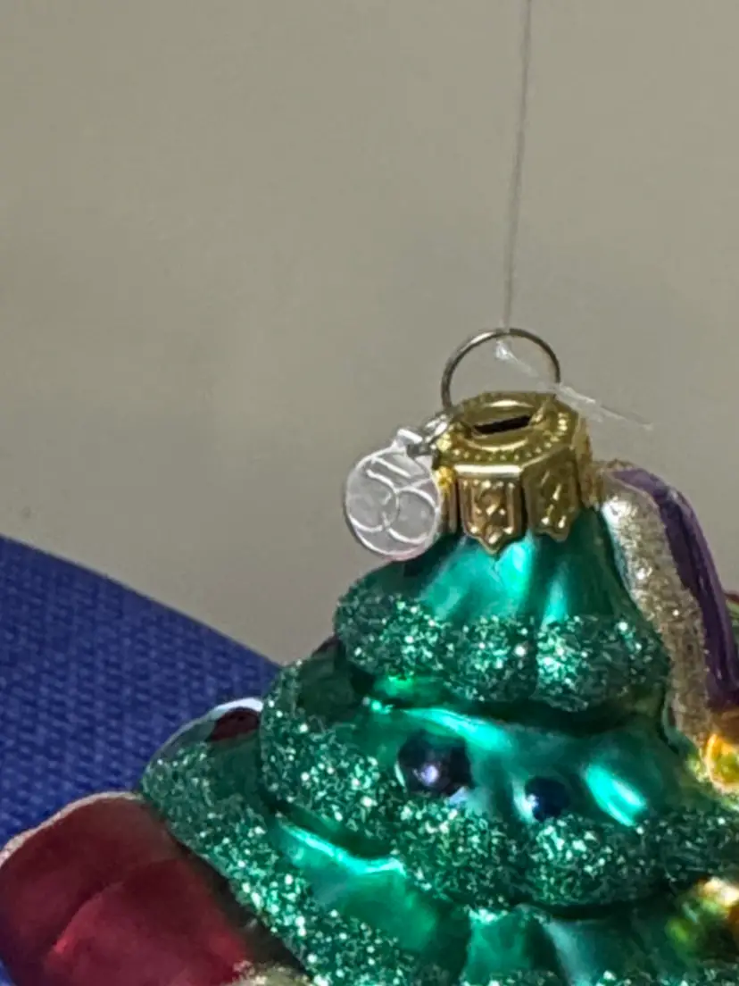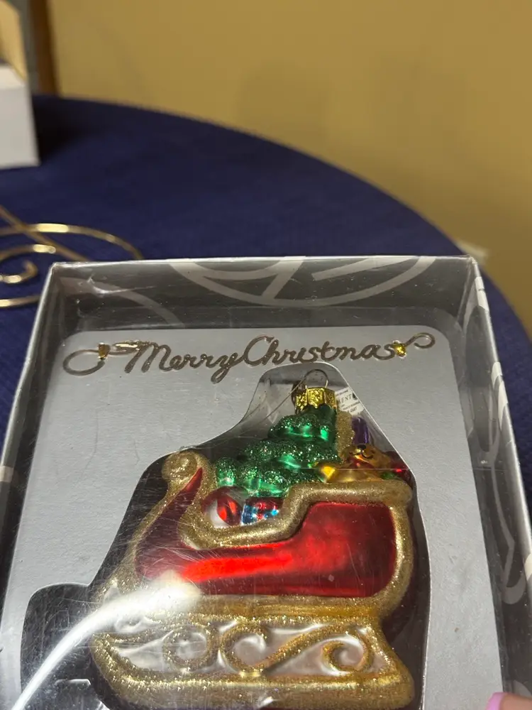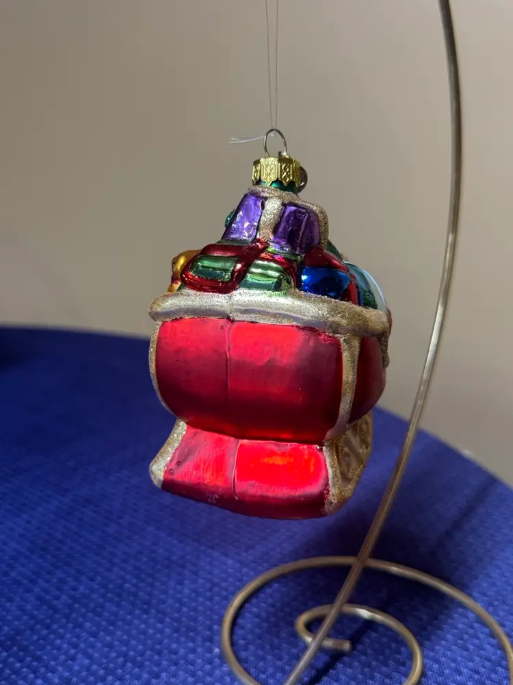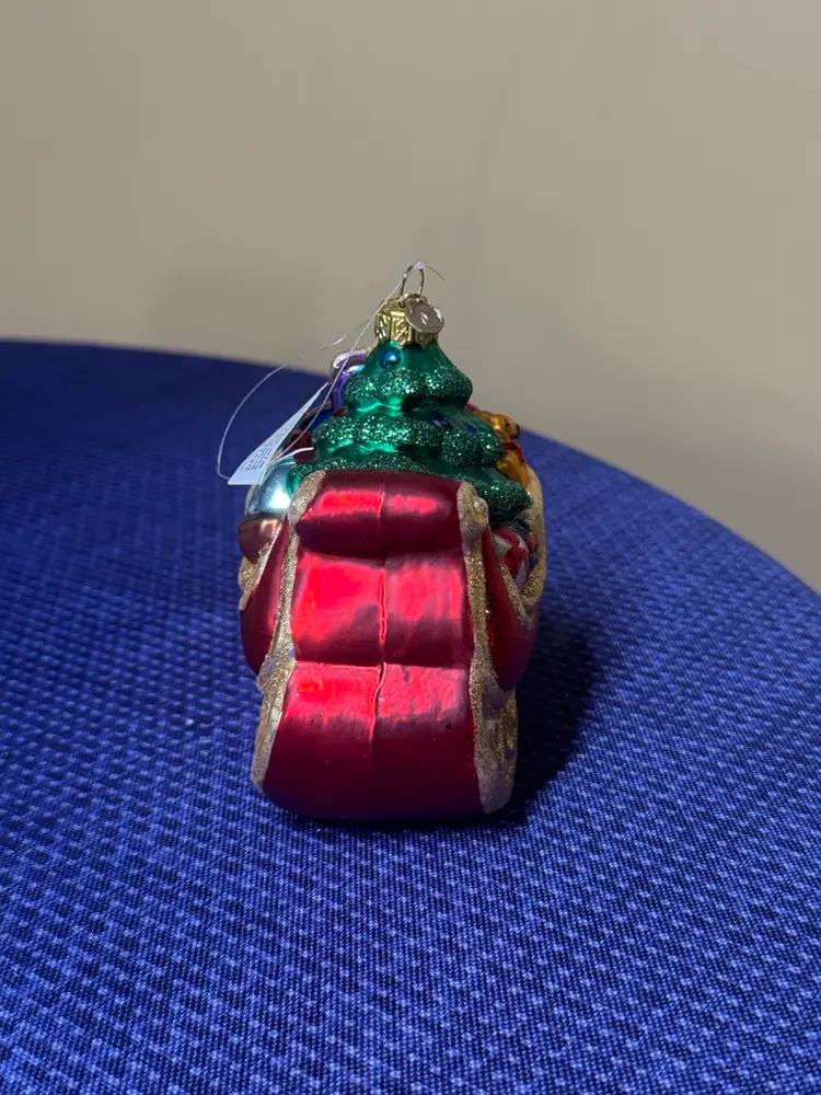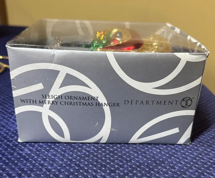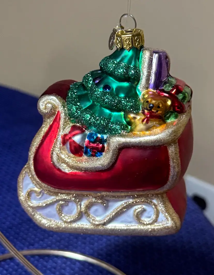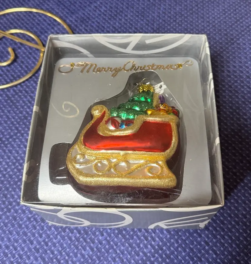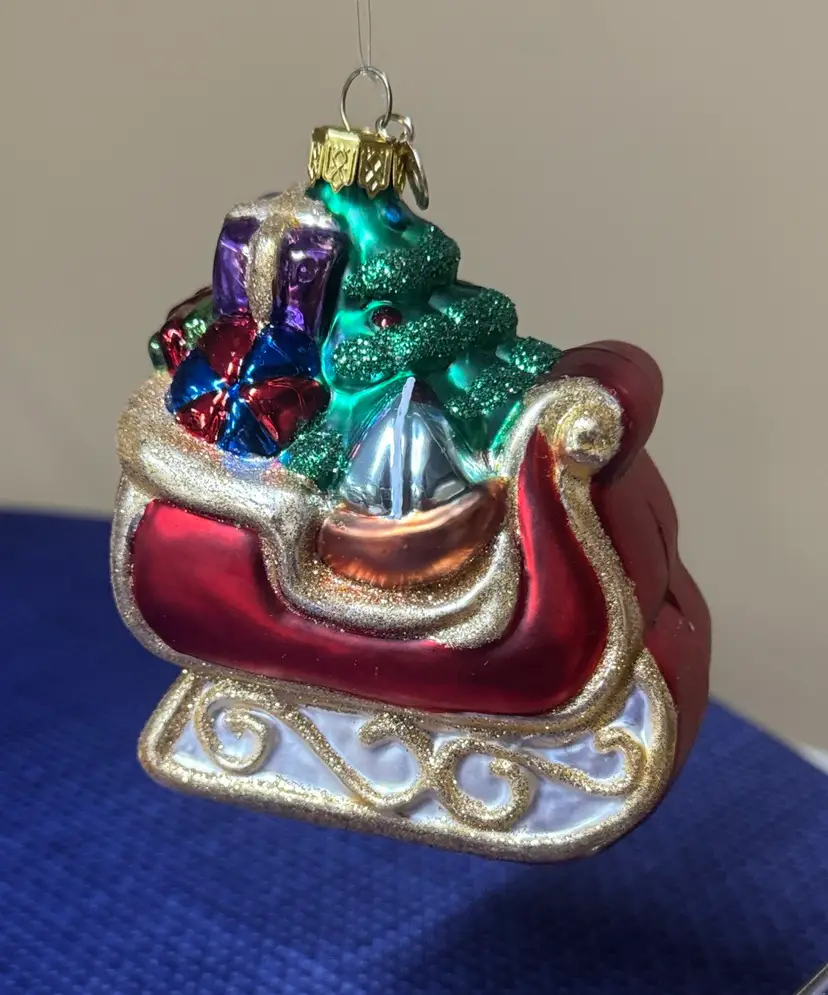 Charming sleigh ornament with a Christmas tree and gifts. Features red, gold, and green accents. Perfect for holiday decor. Department 56 Blown Glass Christmas Sleigh Ornament Comes with a merry Christmas hanger in its original box and original hang tag (1012923254)