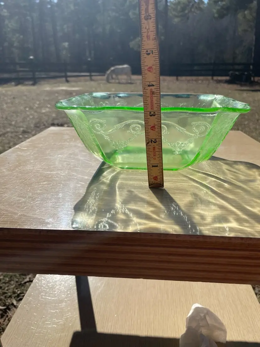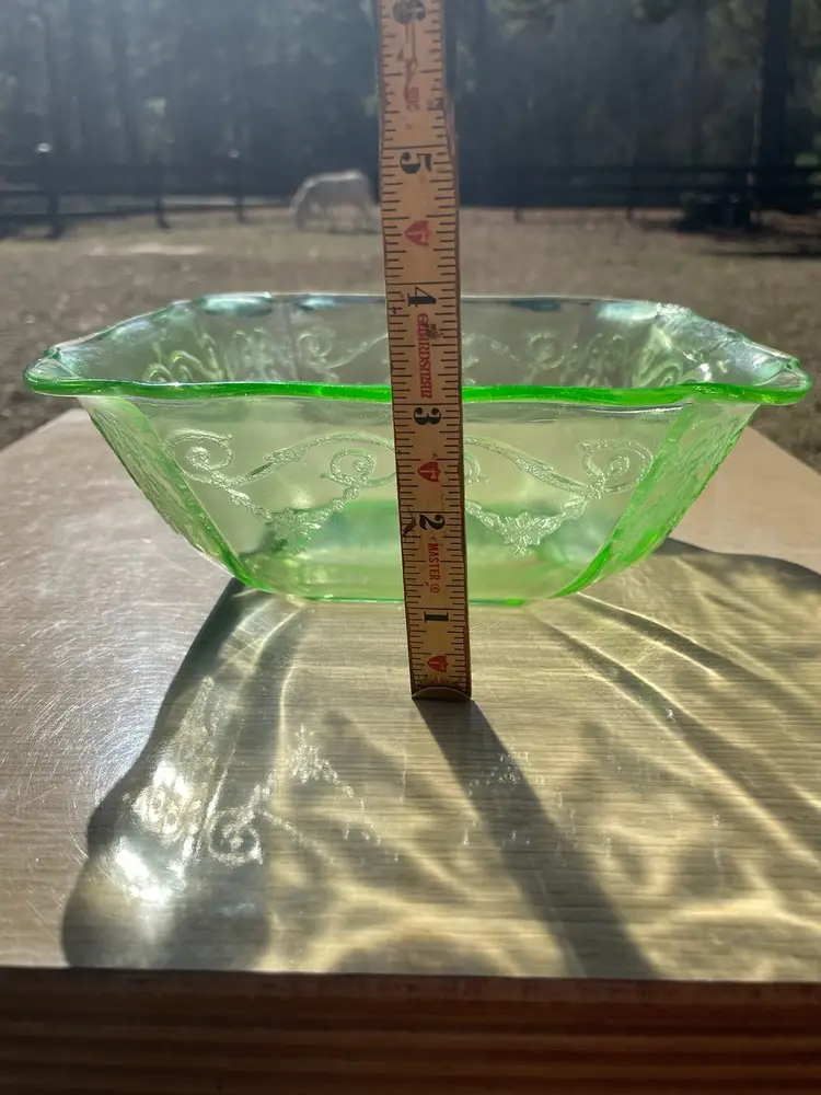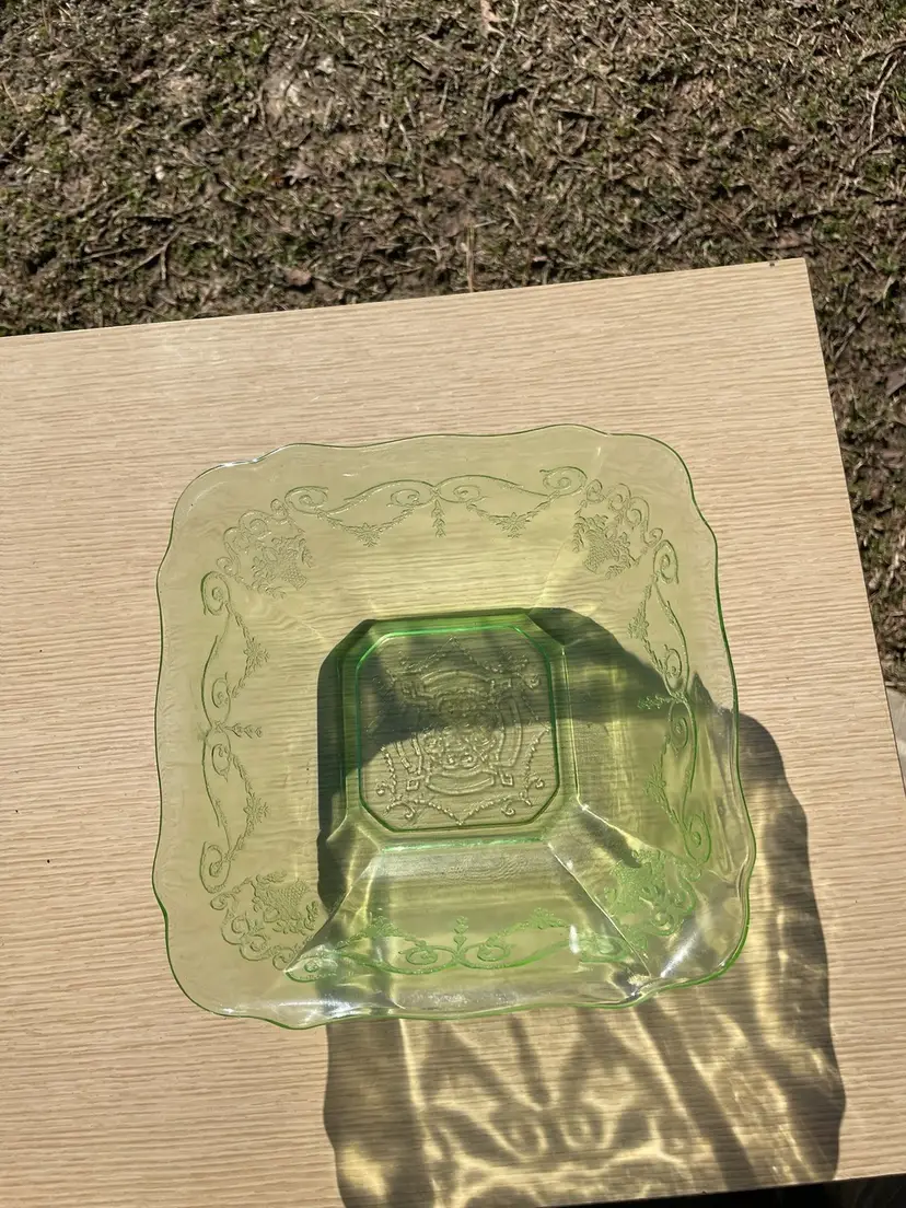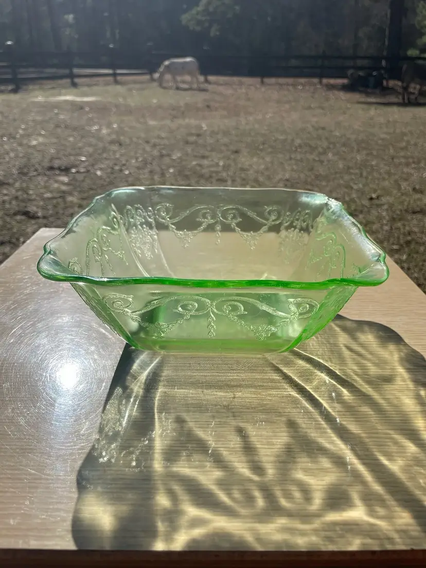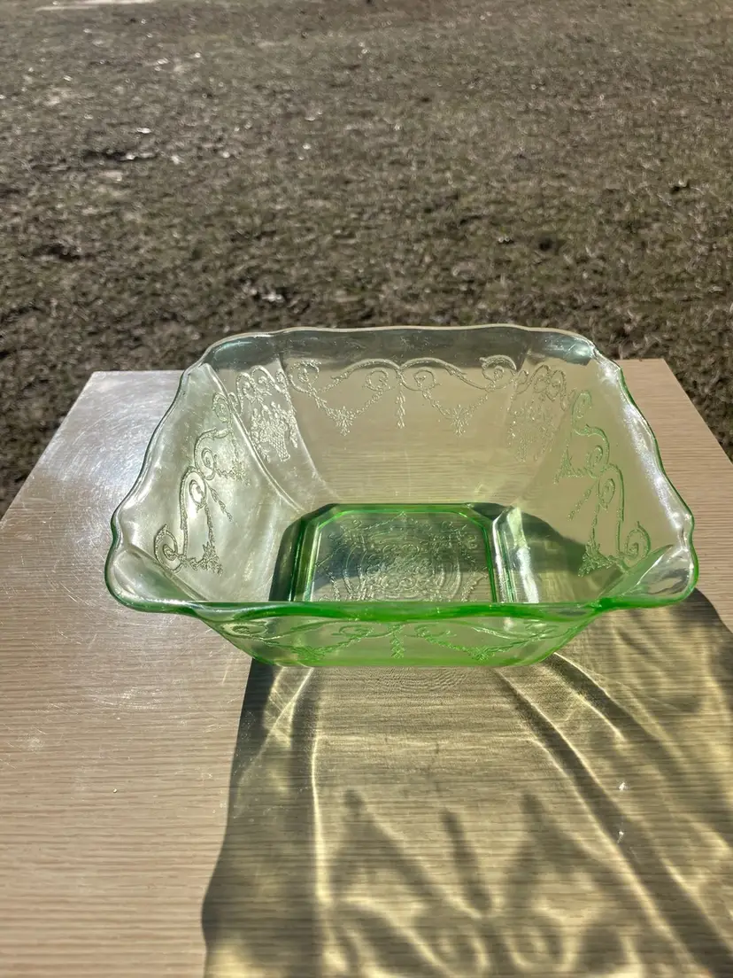 Depression Glass, Lorain "Basket", 8" Square Serving Bowl, Crystal Green