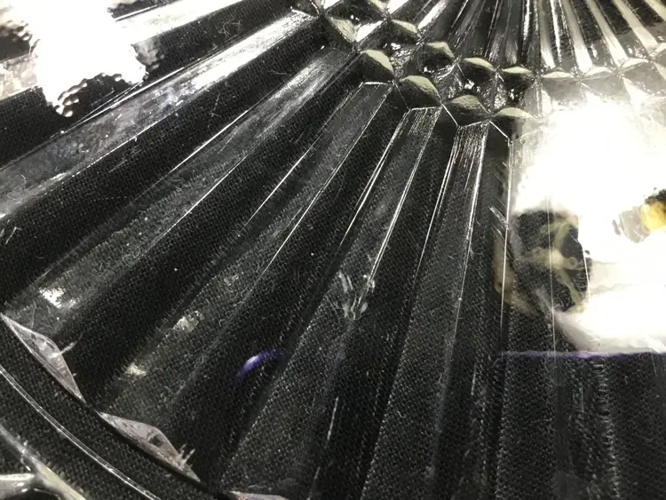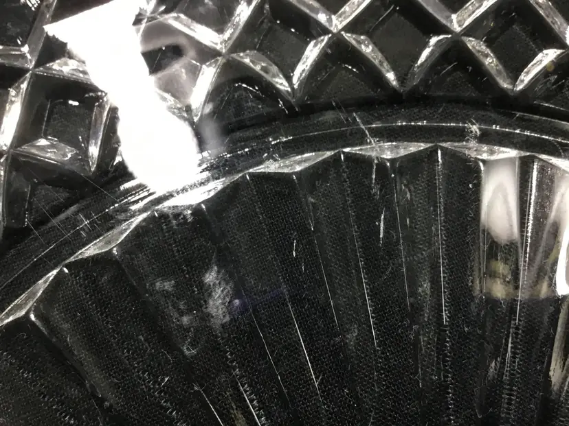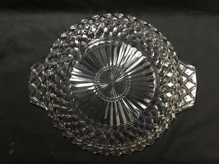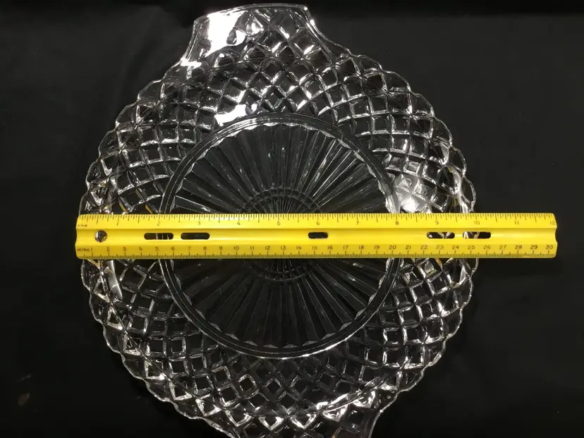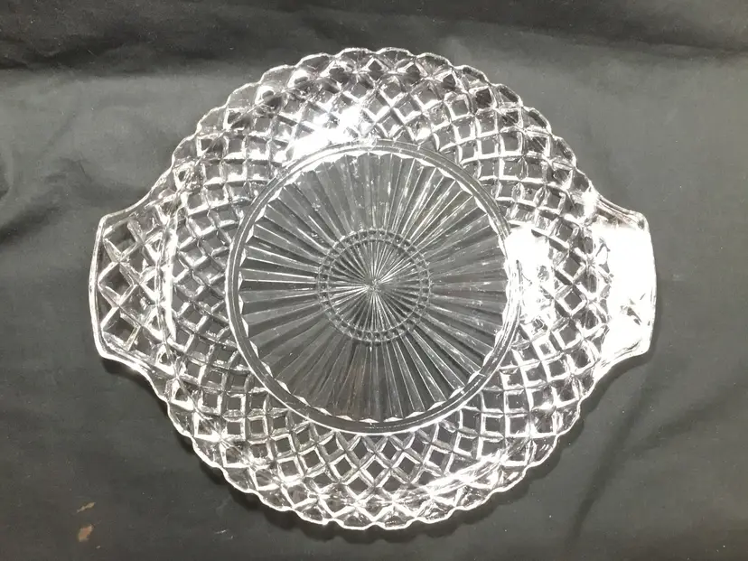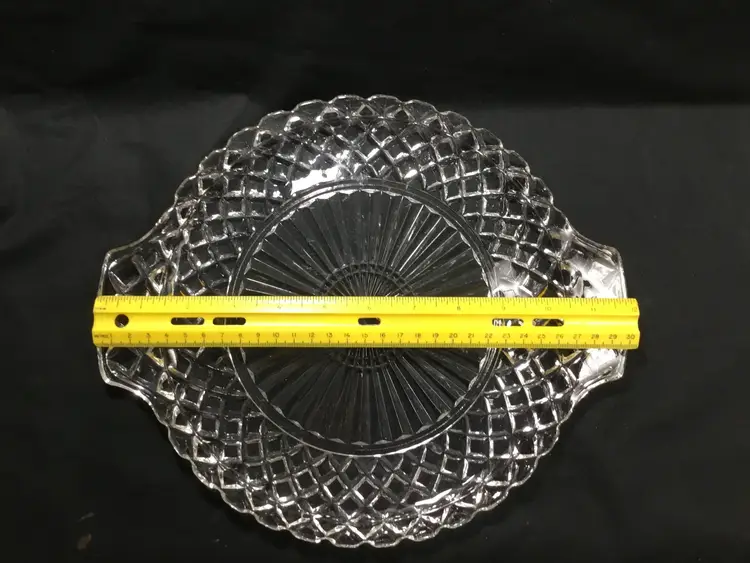 10 inches in diameter with 1 inch handle on each side. Total length is 12 inches. 1/2 inch high. Depression glass serving platter or tray with the Waterford Waffle pattern, made by Anchor Hocking from 1935 - 1944. Some small scuff marks & scratches on tray bed. (See all photos.)