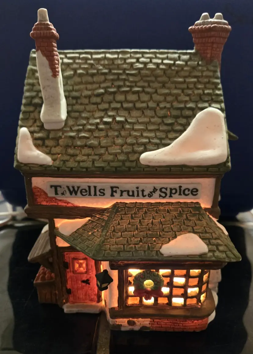 Dept 56 Dickens Village T. Wells Fruit And Spice Shop 1988 Works No Box - roughly stands about 7 inches in height and 5 inches wide.