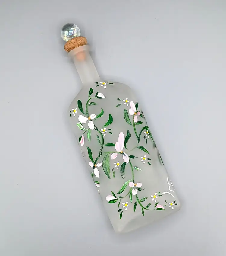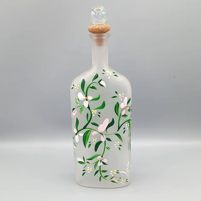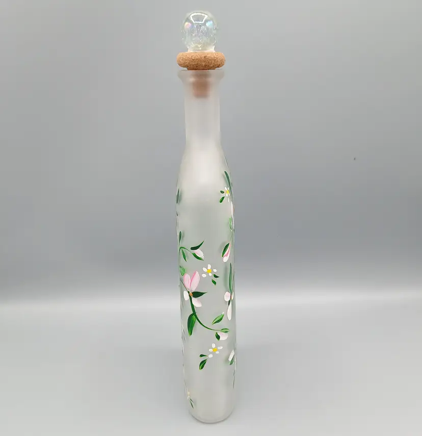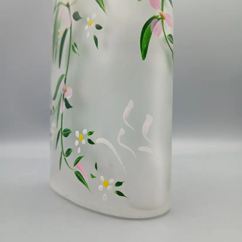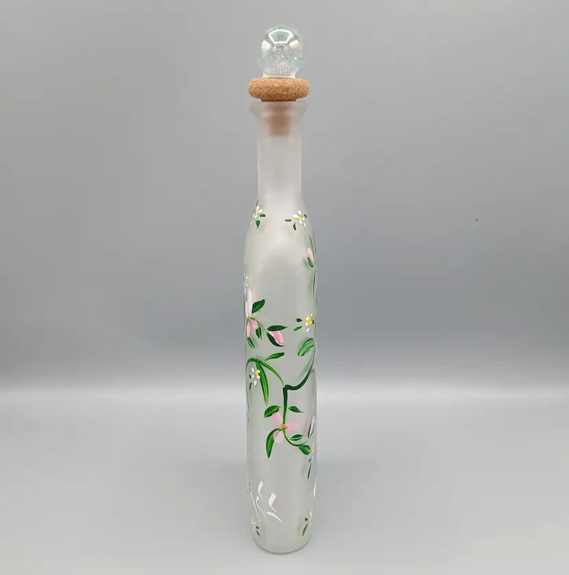 I have several hand-painted items like this that I'll be featuring in my next live auction. Please give a follow to be notified. This was the only Dept 56 bottle that I found in the collection. The delicate floral painting is well suited to this interesting satin finish bottle. And there is no damage. The bottle is 9" high without the stopper, a bit over 10" with. It's about 3" wide and under 2" deep. Thanks for looking!