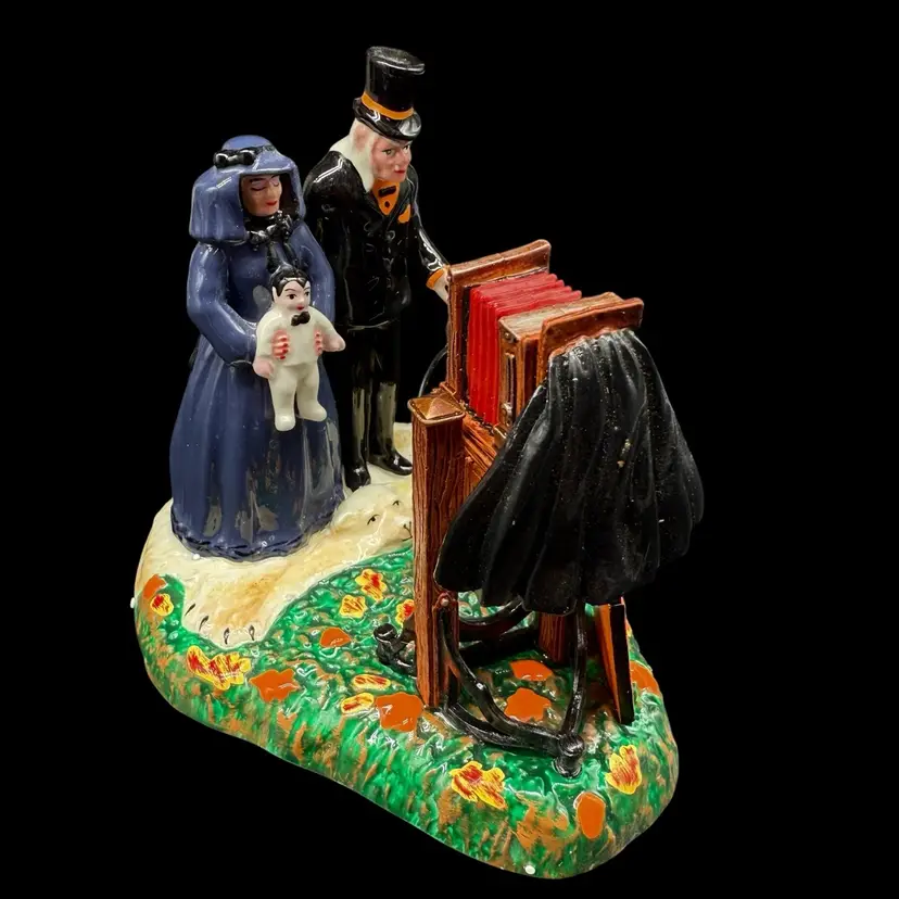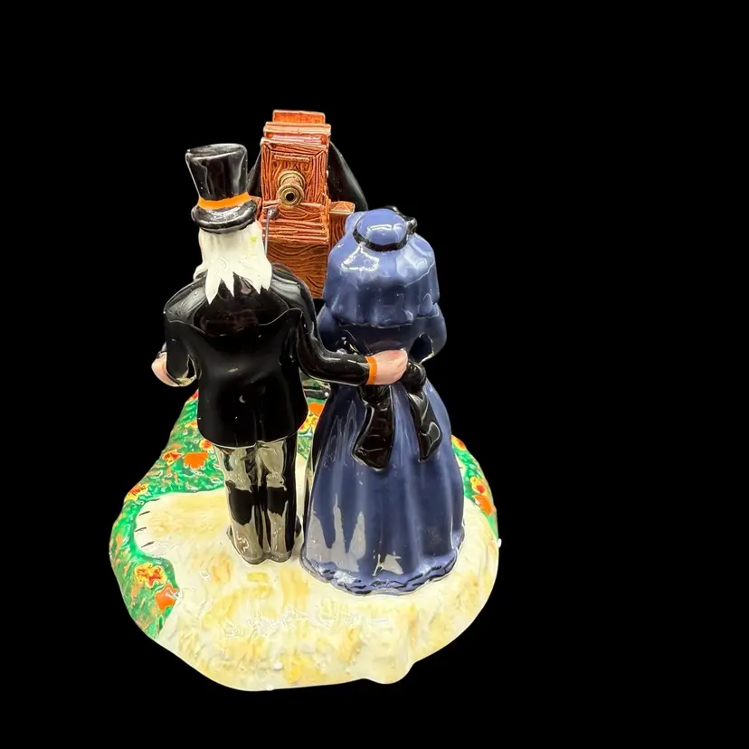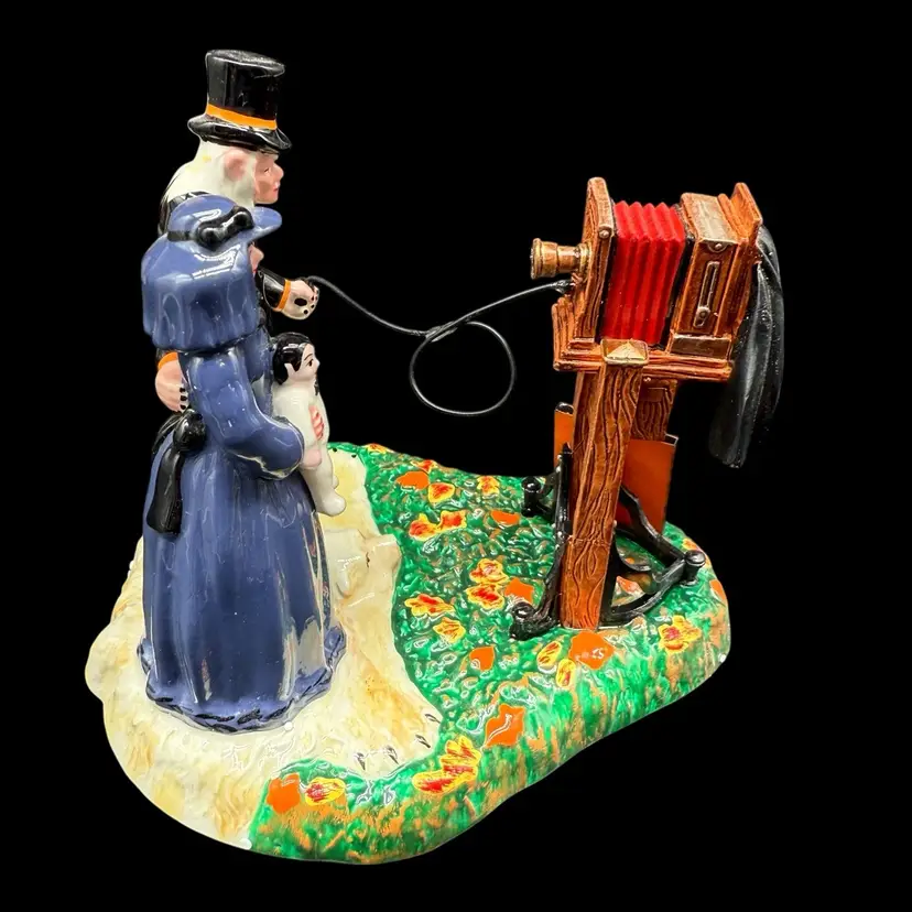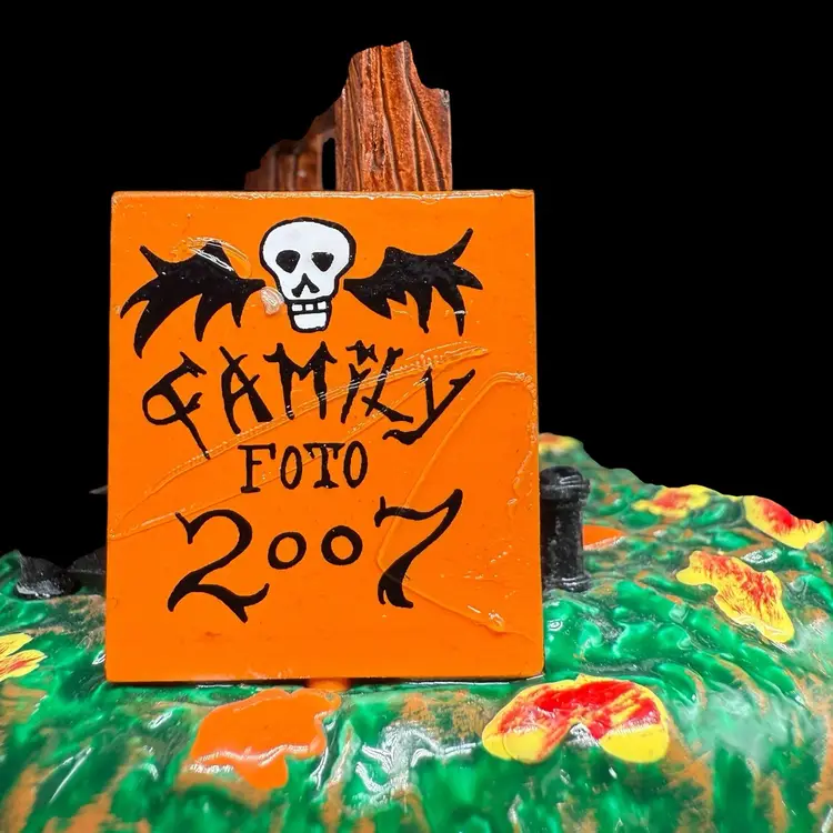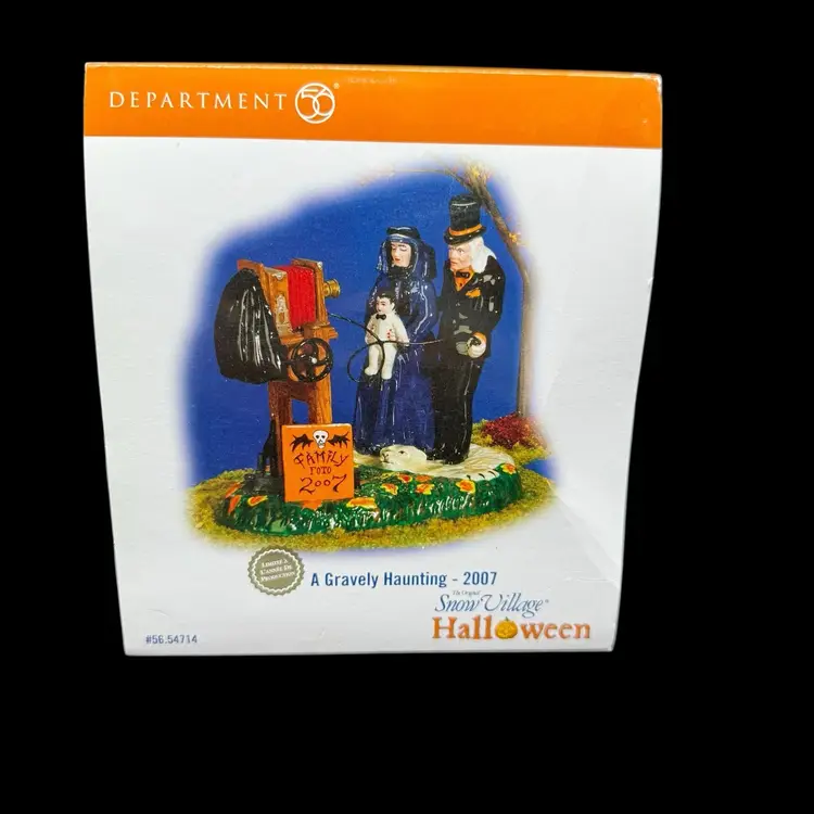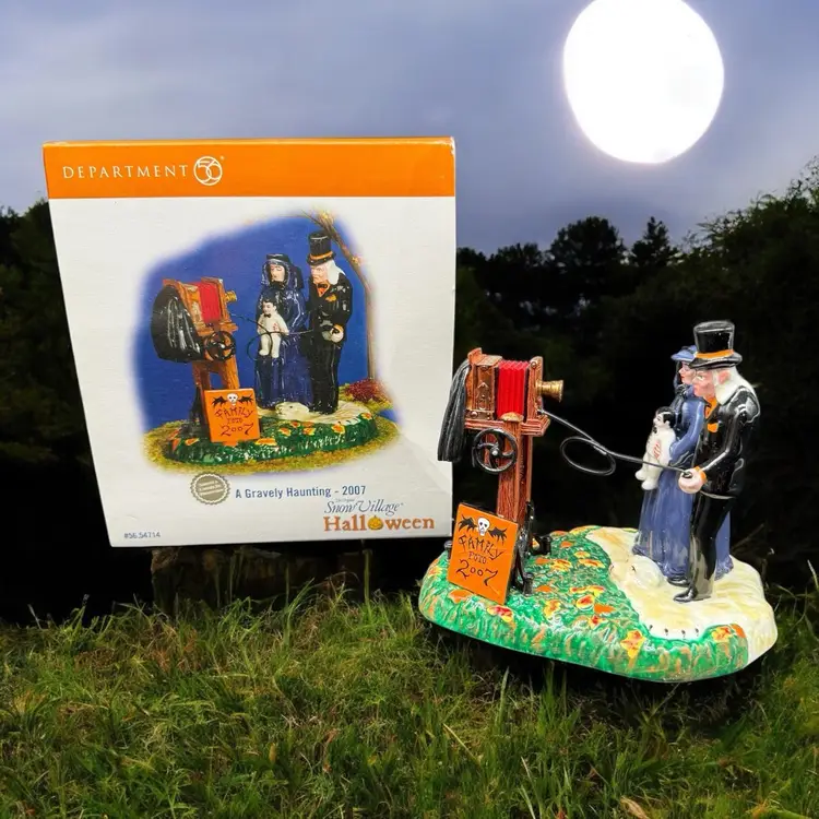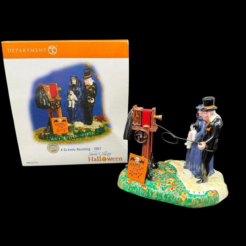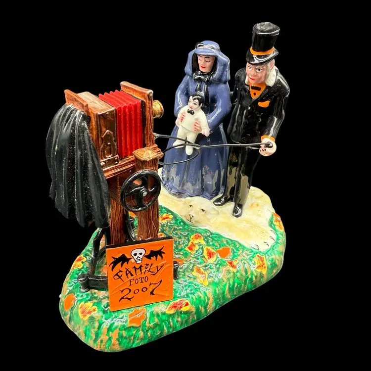 The Dept. 56 Halloween Village Accessory - A Gravely Haunting Family Foto 2007 Retired 54714 is a ceramic and porcelain piece depicting a spooky family photo shoot, perfect for your Halloween decor. Manufactured in 2007, this village accessory from Department 56 features a multicolor design with a Halloween theme. Packaged in the original box, this collectible is a great addition to any Halloween village display.