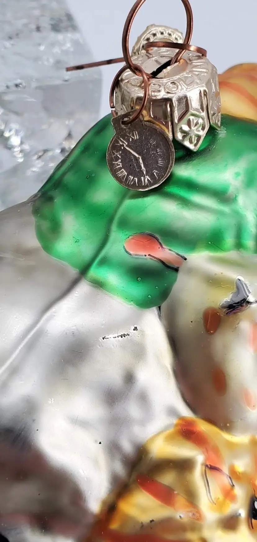It is in overall very good condition. The mini ornament of a dove is missing. There is a tiny scratch at the top of the ornament. See pictures for detailed views.