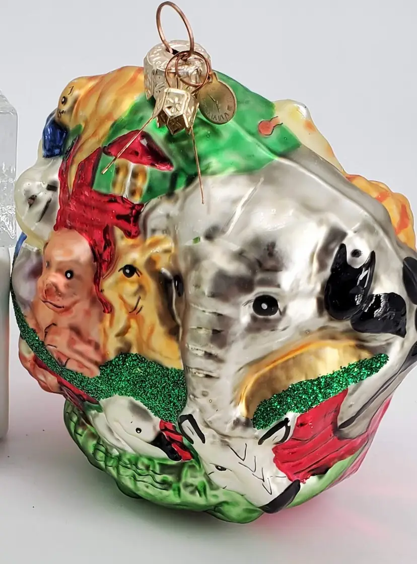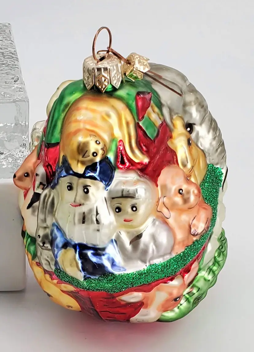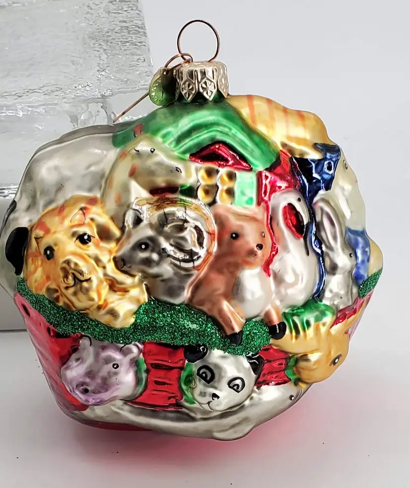 Colorful Department 56 mercury glass ornament depicting a very crowded Noah's ark. It measures 4.25" tall and 4.5" wide. You will definitely be able to see this one on your tree! Made in Poland.