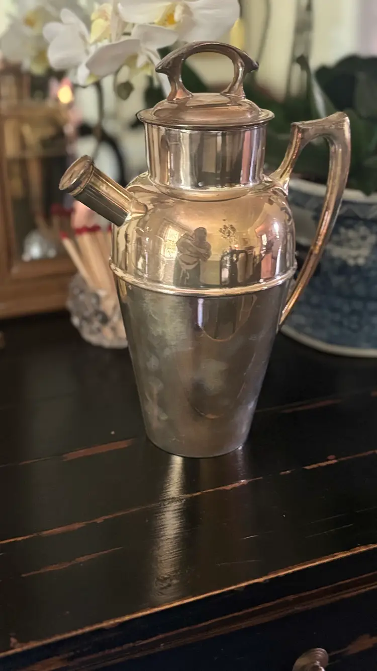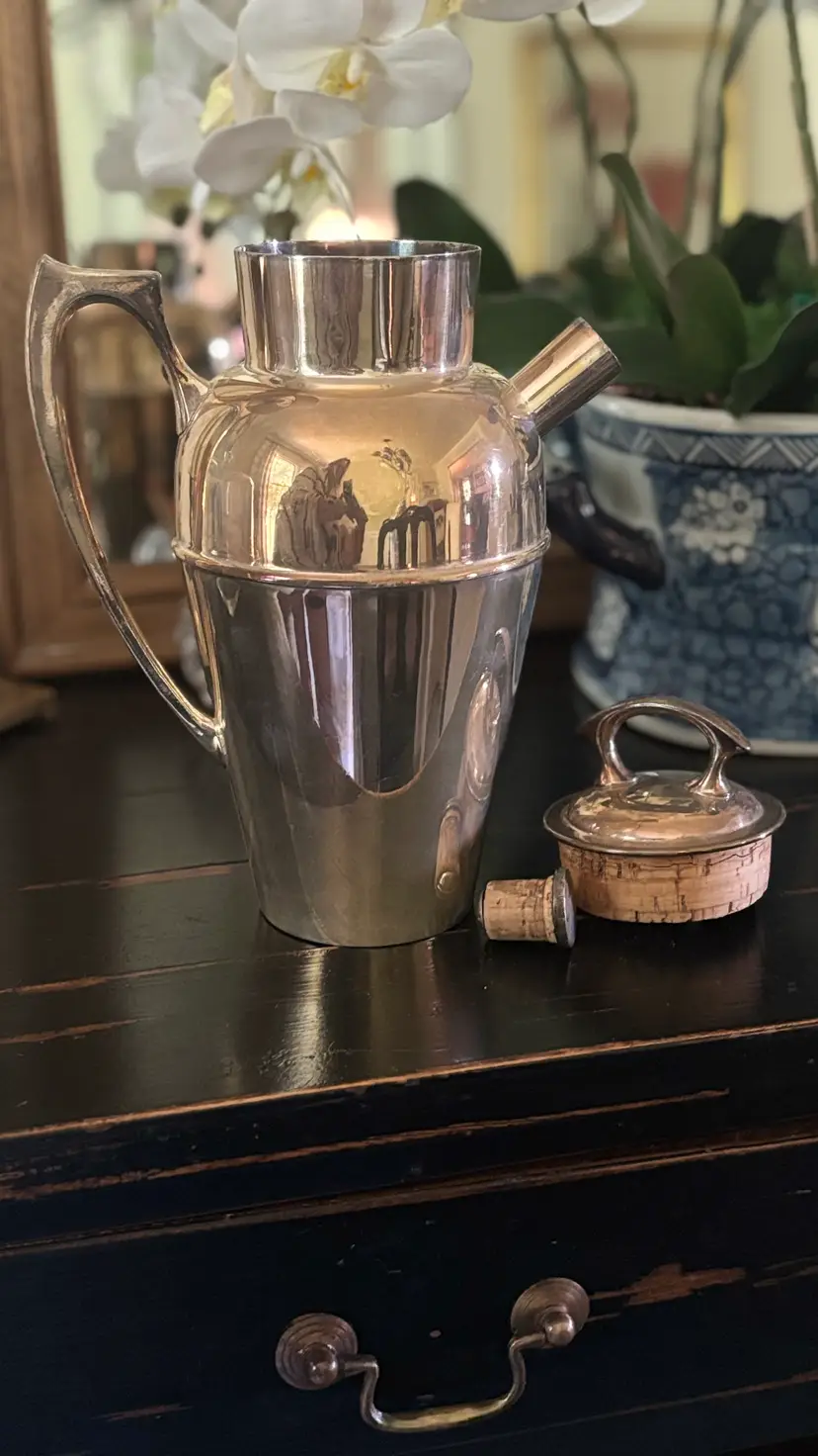 Beautiful with a bit of wear as a loved piece should be. Polishes up bright. All cork in excellent condition. These shakers are often characterized by their early 20th-century origins, Art Deco or Art Nouveau styles, and features like angled spouts, internal strainers, and distinctive handles.