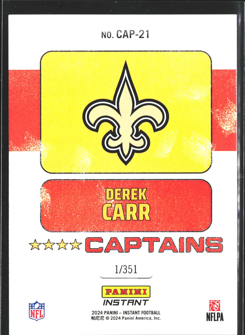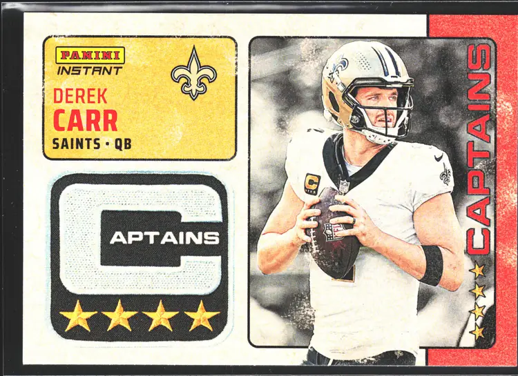 1st time buyer? Get $5 Off with code DISTRICT5 at checkout! Card as shown. All cards $20 and under ship PWE via lettertrackpro [https://www.letter-track.com/registerap.asp?AFID=8757] Type: Sports Trading Card League: National Football League (NFL) Team: New Orleans Saints Sport: Football Season: 2024 Manufacturer: Panini Player/Athlete: Derek Carr Set: 2024 Panini Instant NFL Features: Limited Edition, Serial Numbered Parallel/Variety: Limited Autographed: No Year Manufactured: 2024 Vintage: No Graded: No Material: Card Stock Original/Licensed Reprint: Original Country/Region of Manufacture: United States