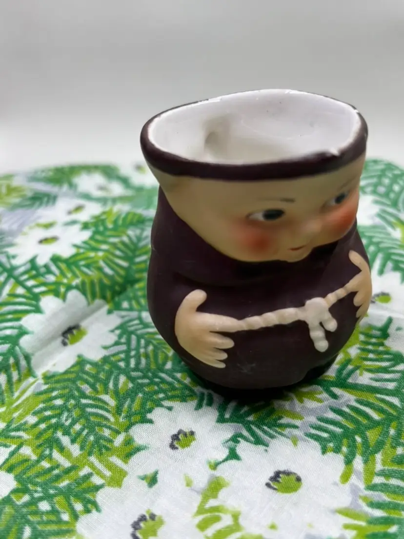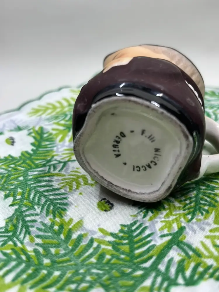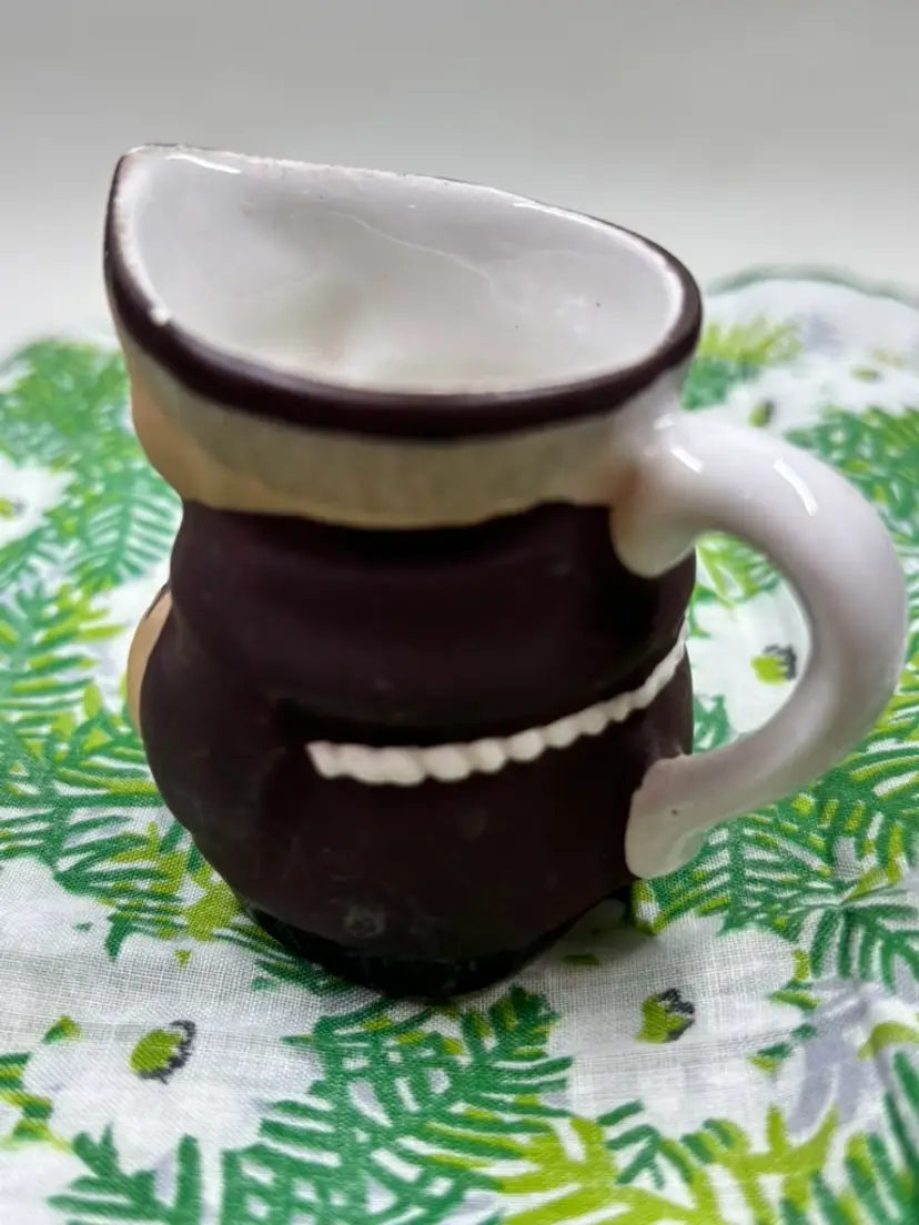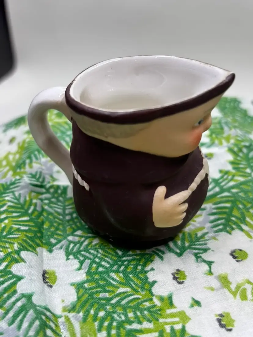 A small figural creamer made of Italian maiolica (tin-glazed earthenware). It is shaped and hand-painted to resemble a Friar or Monk in a dark brown hooded robe. It features a simple white handle and a spout formed by the cowl of the robe. The base is marked F.lli Niccacci - Deruta (F.lli is the abbreviation for Fratelli, meaning 'Brothers' in Italian). Fratelli Niccacci workshop, run by Mr. Aldo Niccacci, was known for producing these popular Franciscan friar figures for the souvenir and tourist shops in nearby Assisi until 2009-10 after the owner's retirement. The piece is approx. 2.5" tall x 2" wide. There look to be two small spots of paint loss on the rim of the creamers top edge due to its age, but otherwise no chips or cracks or crazing.