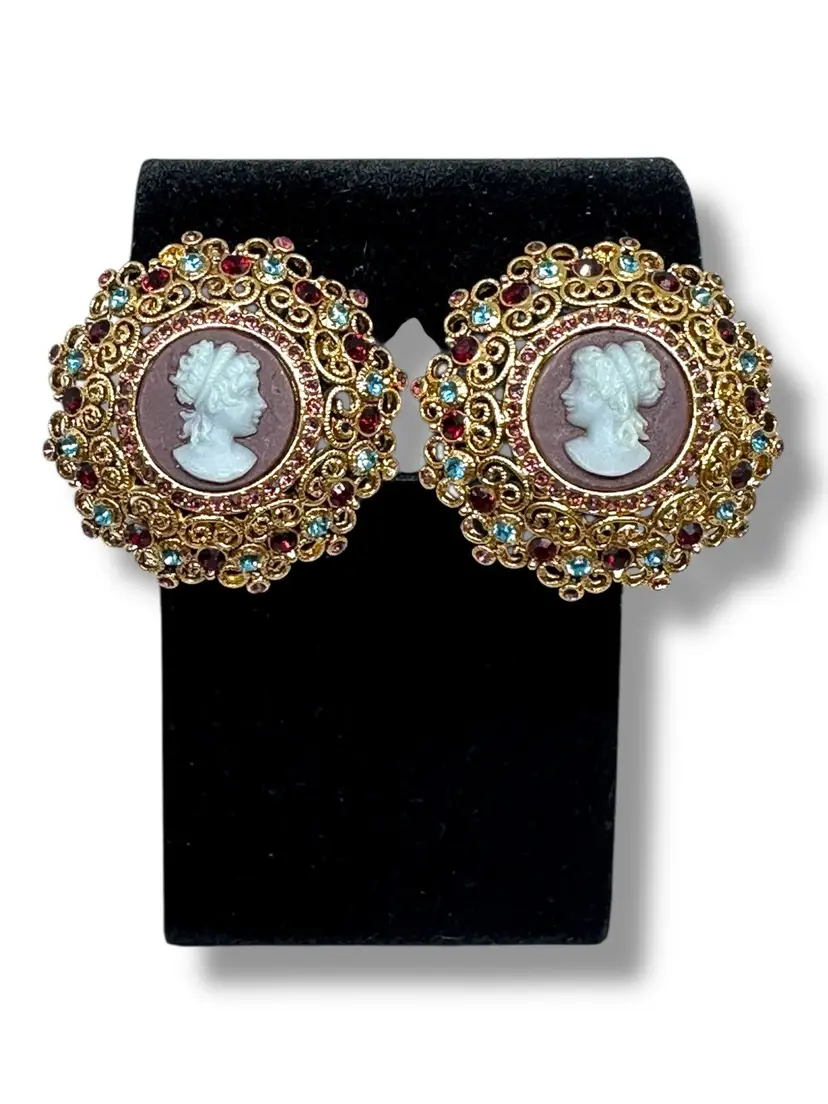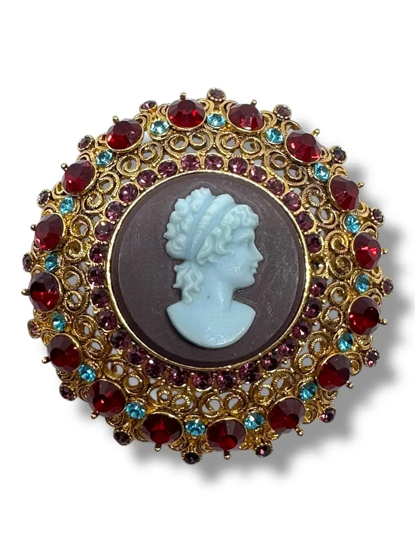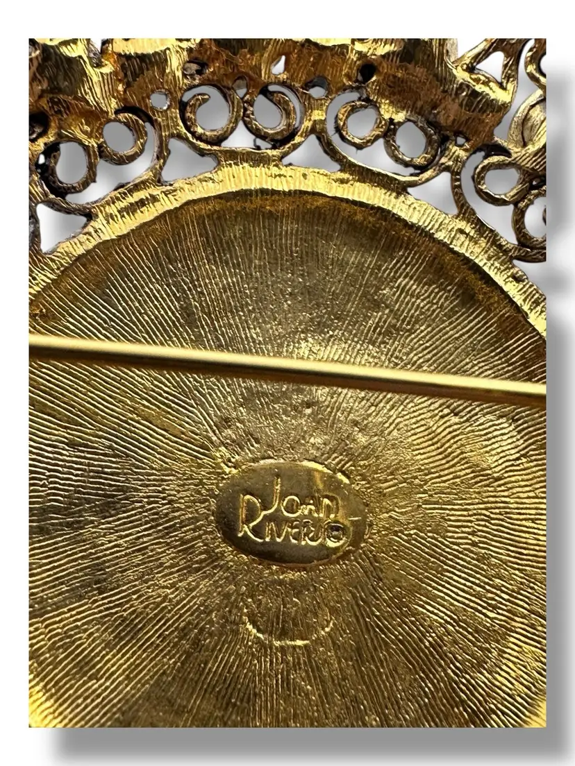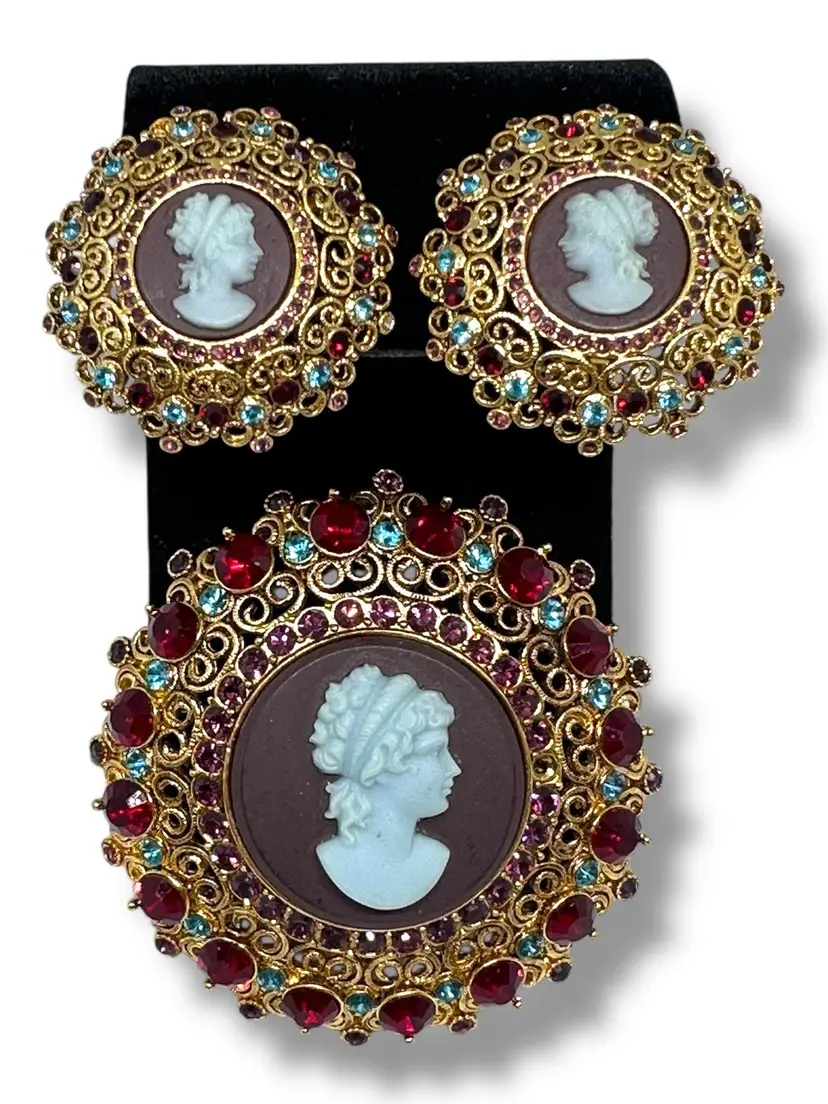 Designer Signed Joan Rivers Cameo Brooch and Earring Set. This set is detailed and stunning! It is hard to find as a set. Rich colored rhinestone crystals of aqua blue, purple amethyst, and ruby red are all set in a gold tone filigree frame. The brooch measures 2-3/8" across. The matching clip-on earrings measures 1.25". All pieces are signed on the back. This will be carefully packaged and shipped right away.