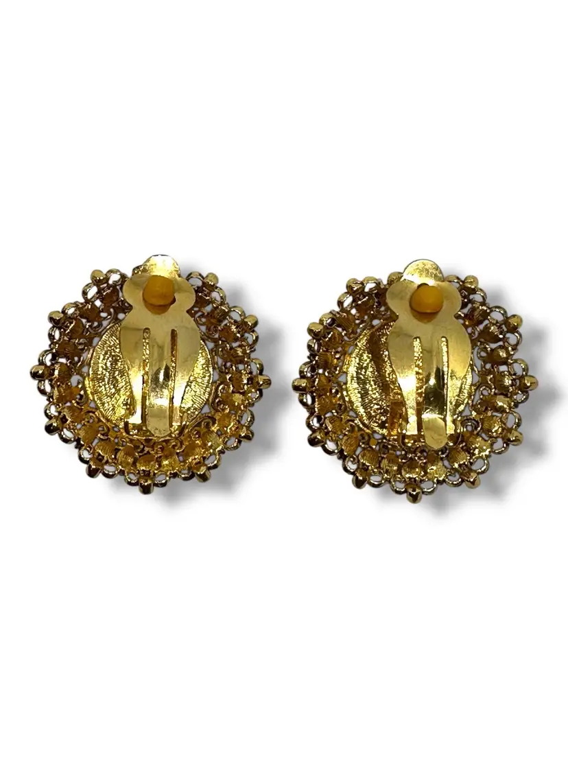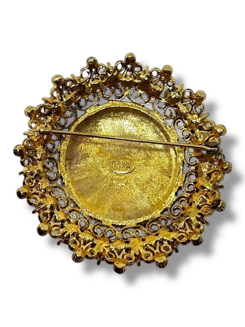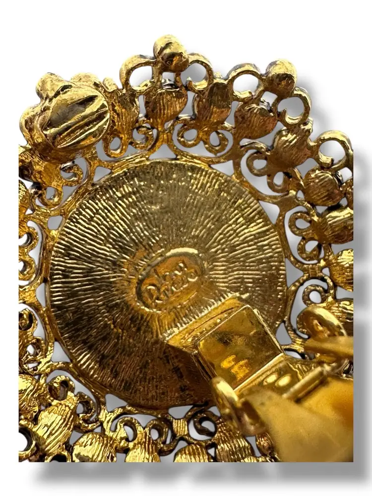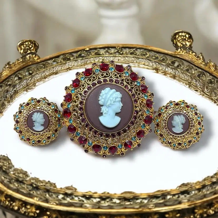 Designer Signed Joan Rivers Cameo Brooch and Earring Set. This set is detailed and stunning! It is hard to find as a set. Rich colored rhinestone crystals of aqua blue, purple amethyst, and ruby red are all set in a gold tone filigree frame. The brooch measures 2-3/8" across. The matching clip-on earrings measures 1.25". All pieces are signed on the back. This will be carefully packaged and shipped right away.