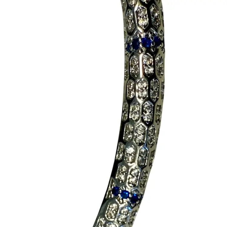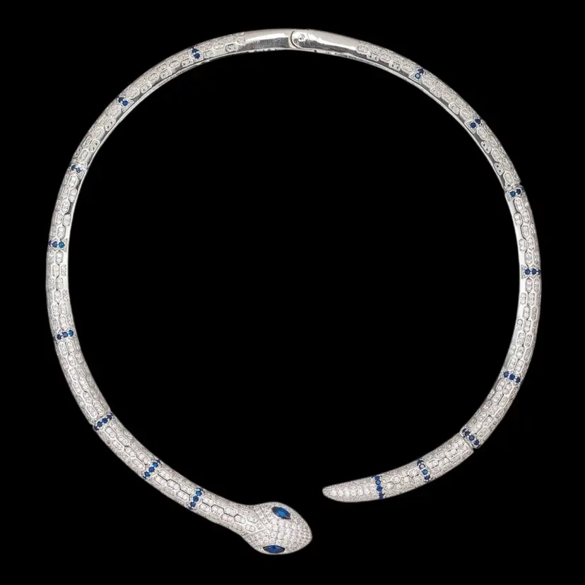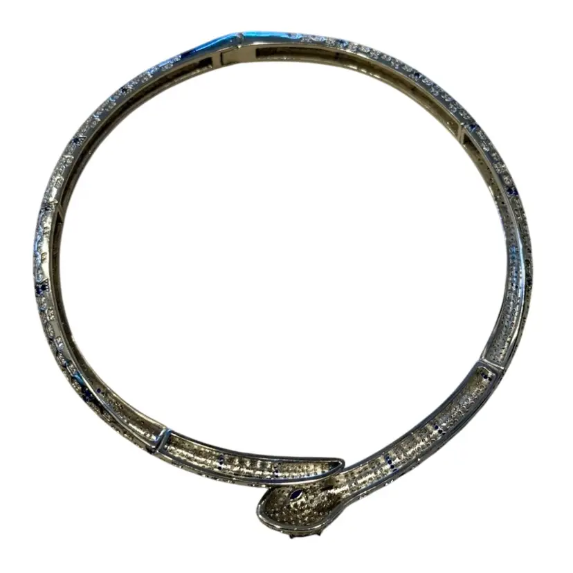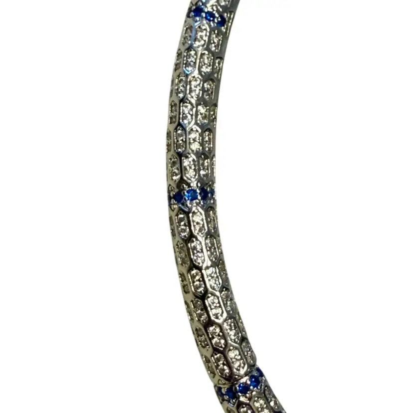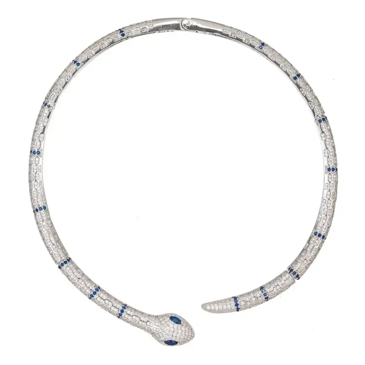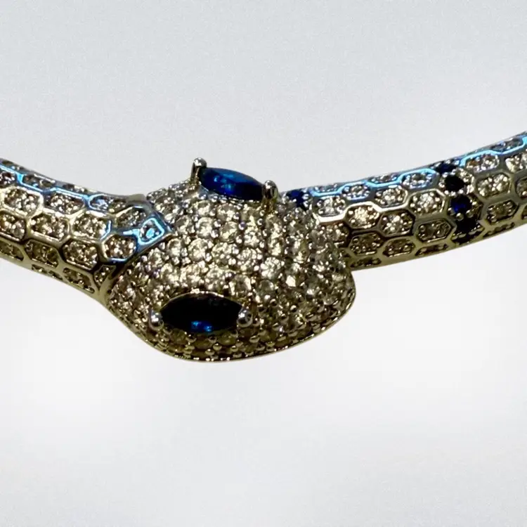 This beautiful Valeria snake cuff necklace is shrouded in dozens of beautiful zirconia crystals, this snake necklace boasts a shiny silver rhodium coloration that makes it radiate a brilliant glow. Metal: Brass Stones: CZ crystals Closure: Hinged Size: approx. 10"