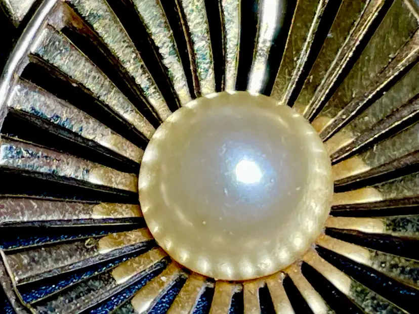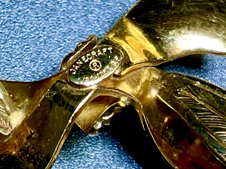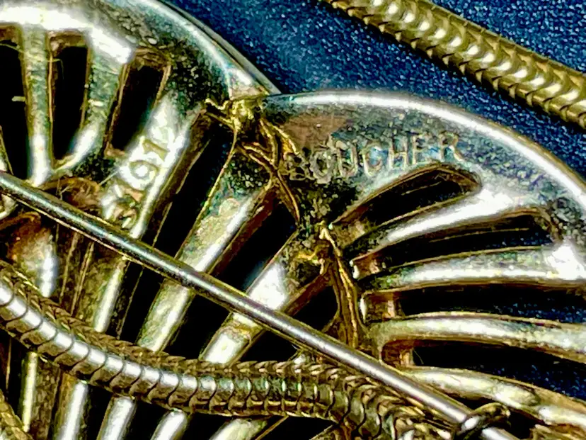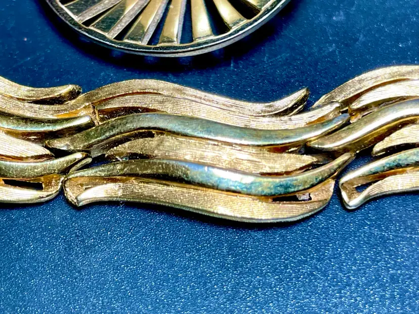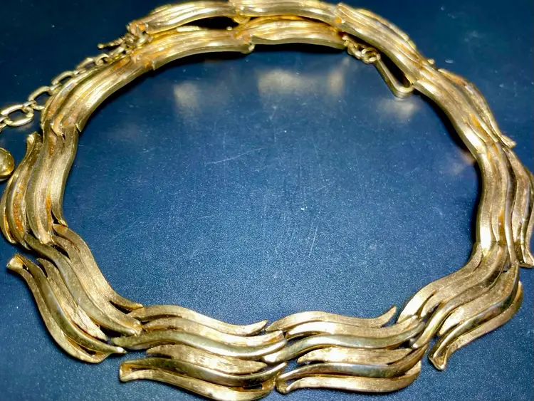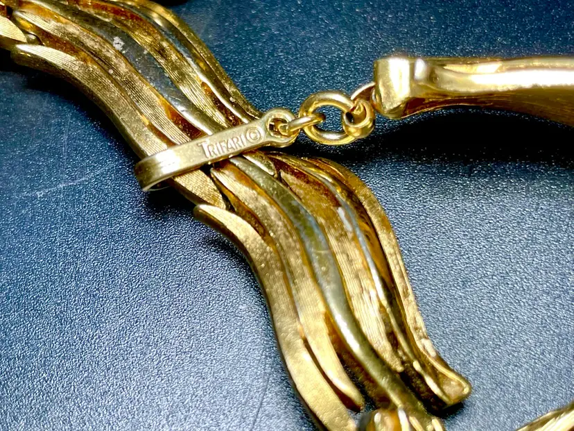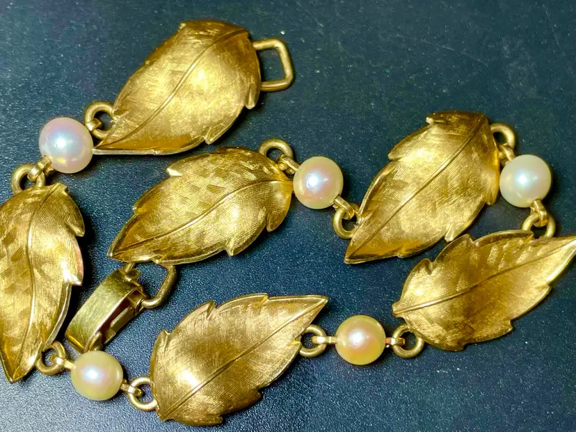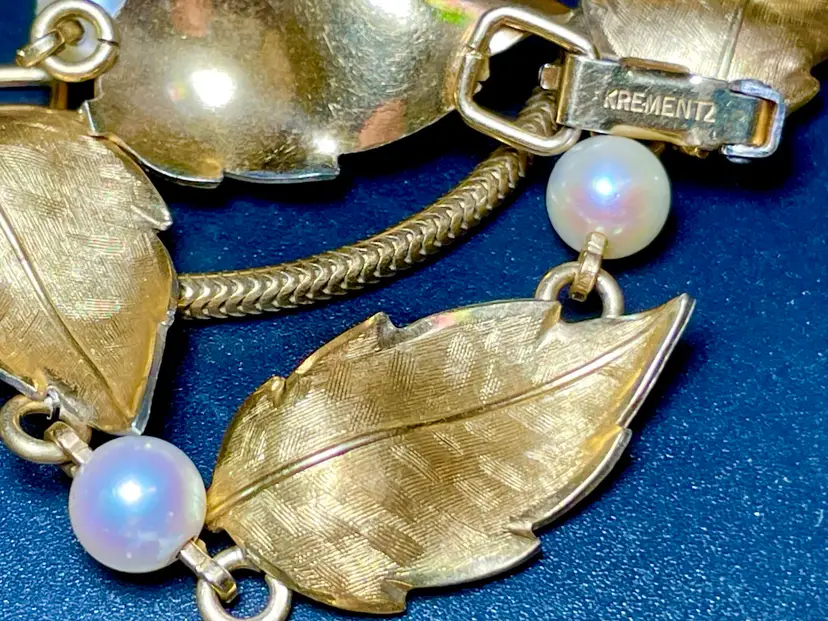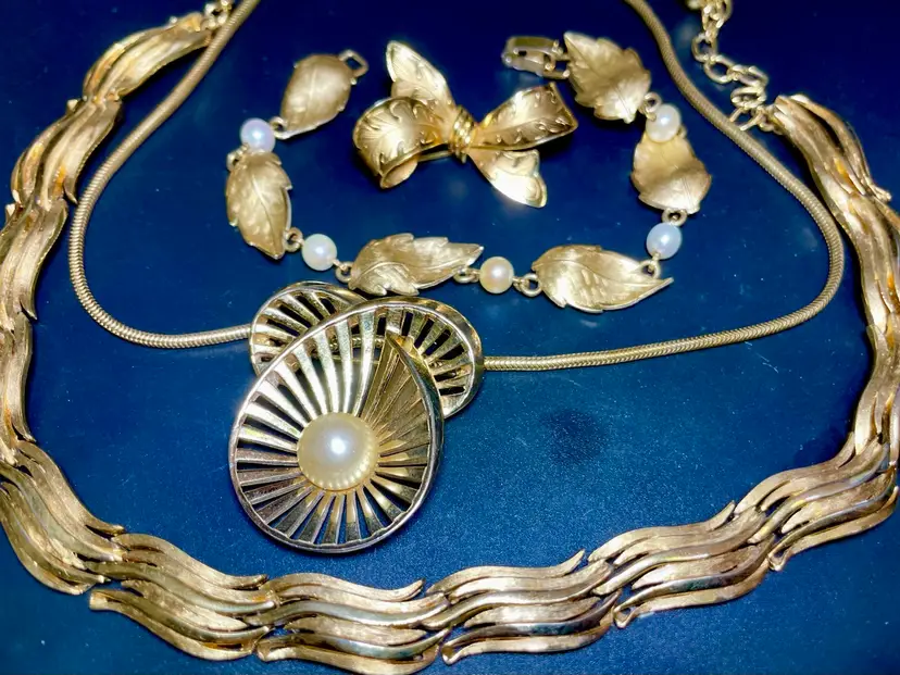 Marcel Boucher necklace pendant with synthetic pearl that can also be converted into a brooch. Signed boucher, number: 3191. Gold plated leaf bracelet with synthetic pearl marked Krementz. 12 karat gold filled ribbon brooch by Danecraft. Wide wavy ribbon statement necklace marked crown Trifari.
