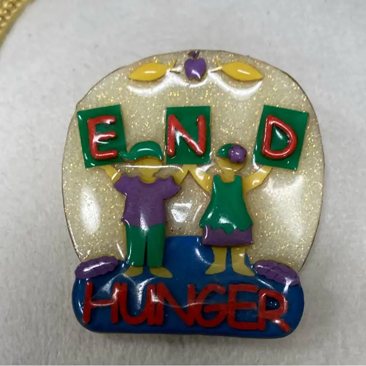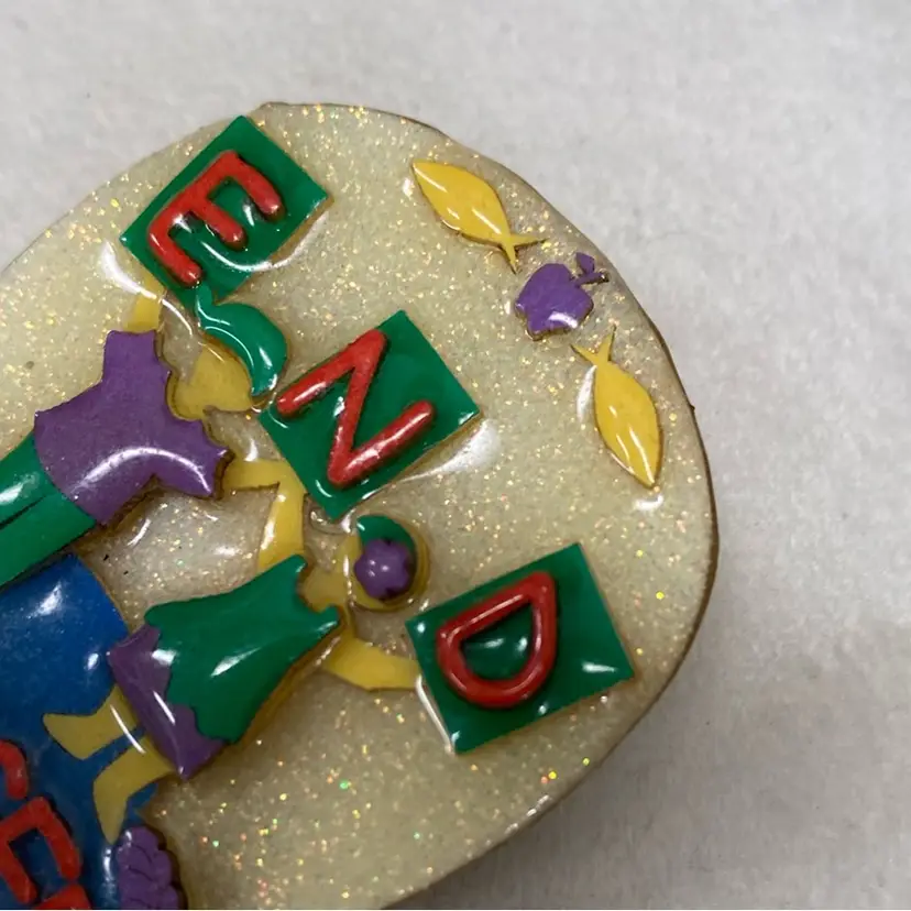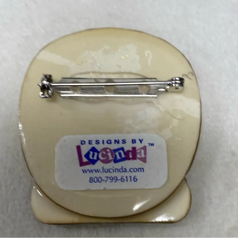 Very detailed and dimensional. Pin is in very good vintage condition. Has ‘Designs by Lucinda’ sticker on the back.