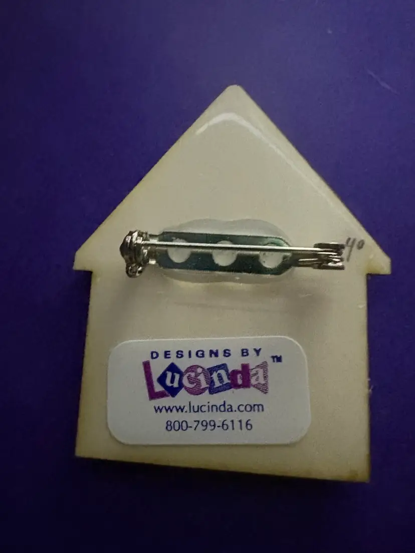 Very detailed and dimensional. Pictures just don’t show how pretty these pins are. Pin is in excellent vintage condition. Has ‘Designs by Lucinda’ sticker on the back.