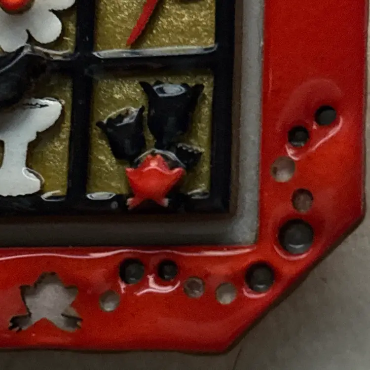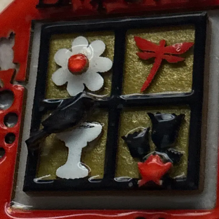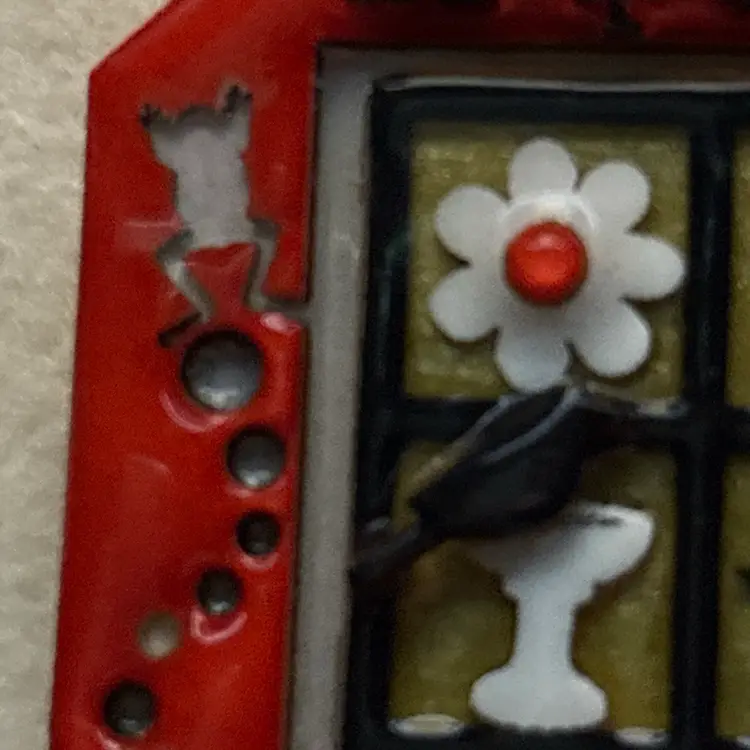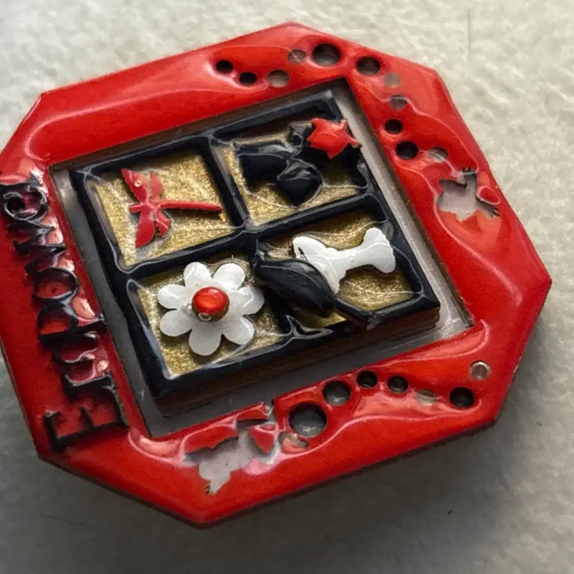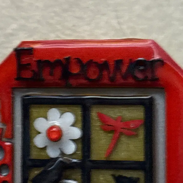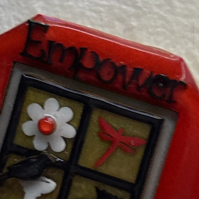 Great vintage Designs by Lucinda pin/brooch featuring the word “EMPOWER”. The cute black and white window pane has a dragonfly, flower, birdbath, and tulips. BUT, there is an unexpected guest hopping around and leaving footprints everywhere before he decided to land on the tulips! 🐸🐸🐸 Such a cute froggie! Wonderful addition to your Lucinda collection.