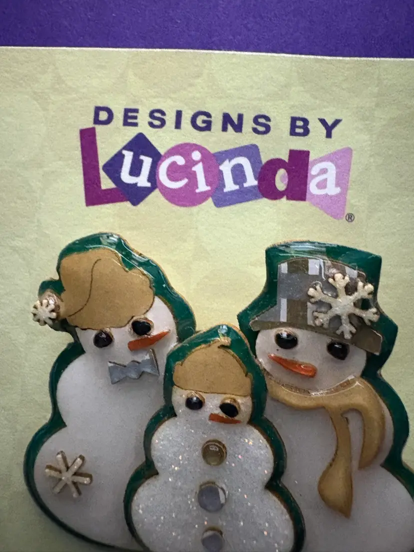 Designs By Lucinda ~ Vintage SNOWMAN FAMILY Pin / Brooch ~ Dark Green Background ~ Kid Is Glittery ~ Each Snowman Has Accessories In Gold. ❄️☃️