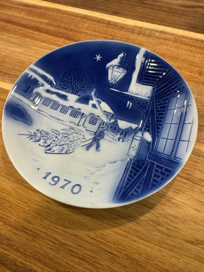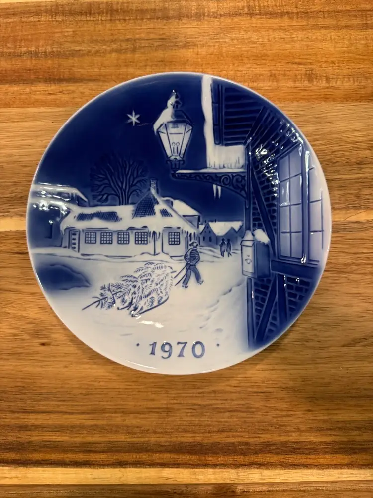 Desiree Denmark blue and white Christmas plate from 1970, featuring a person pulling a Christmas tree through newly fallen snow in a picturesque village. This is the first edition of the “Hans Christian Andersen’s House” series.