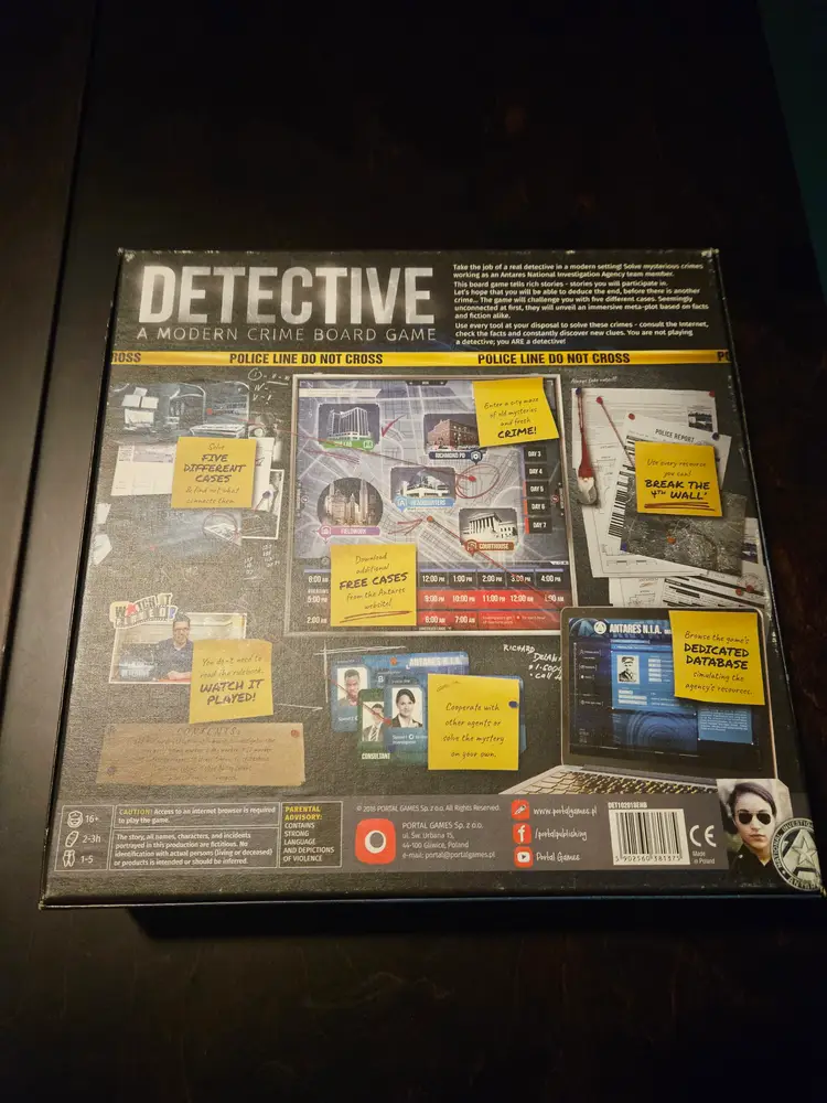 Players: 1-5 Playtime: 2-3 hrs Age: 16+ Designer: Ignacio Trzewiczek Publisher: Portal Games Mechanics: Cooperative Game, Deduction, Narrative, Scenario, Storytelling, and Variable Player Powers. Theme: Detective, Crime-solving