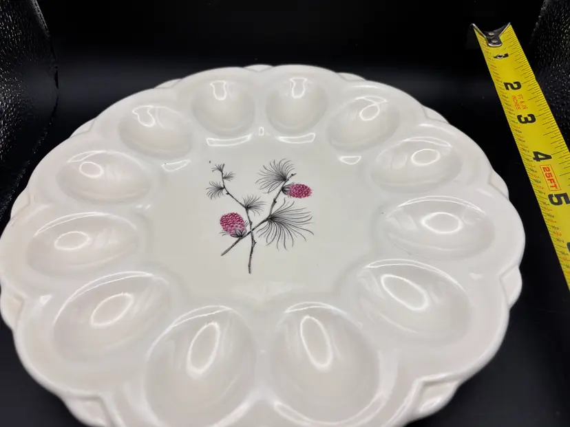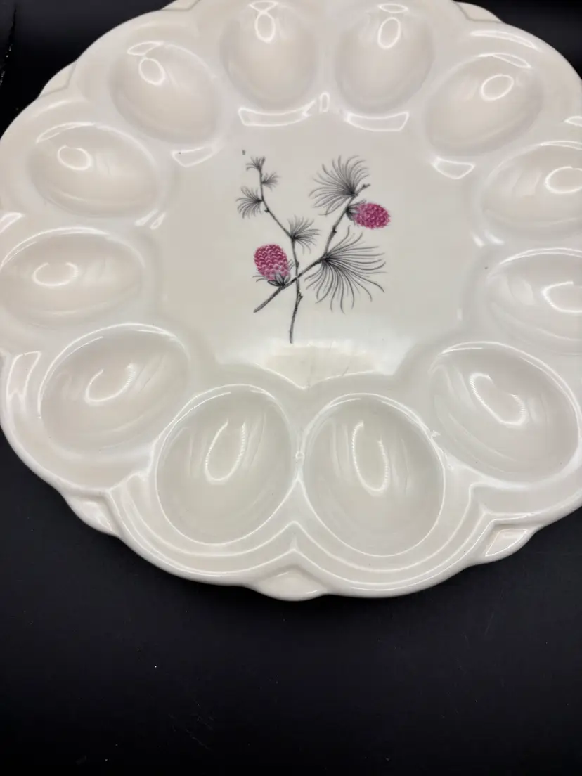 If I liked deviled eggs, I would keep this dish. The pattern is both MCM and so simple. Others have described the design as pink pinecones, but they are wild clover flowers. There is one small ding on the back of the plate which seems to be a glaze issue. See photos for condition.