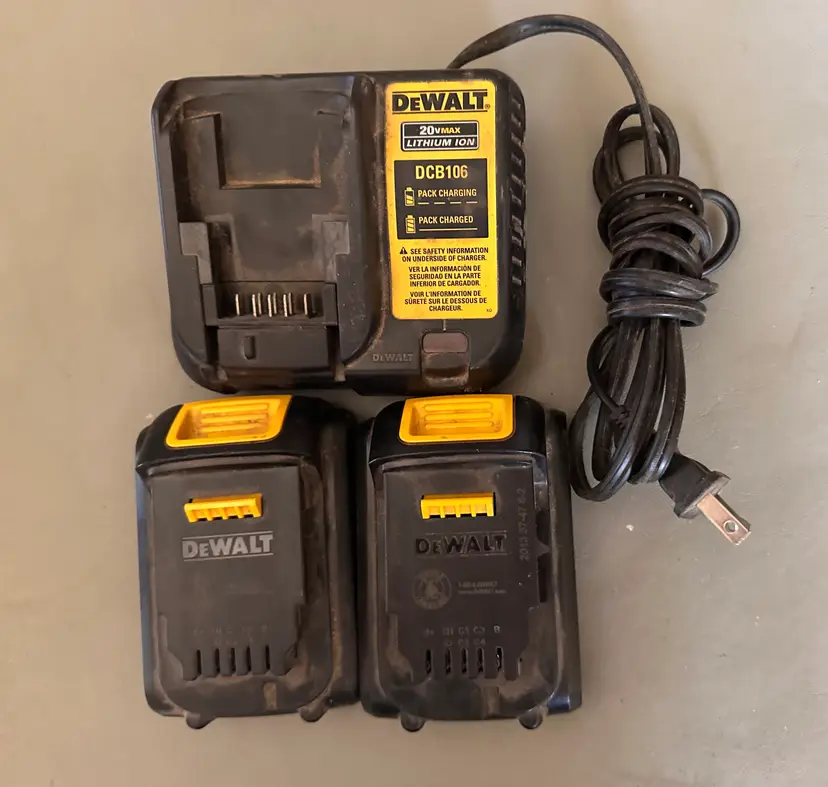 This item is a DeWalt DCB 106 charger for 20 volt batteries and two DeWalt 20 volt batteries type DCW207, rated at 1.3 aH.