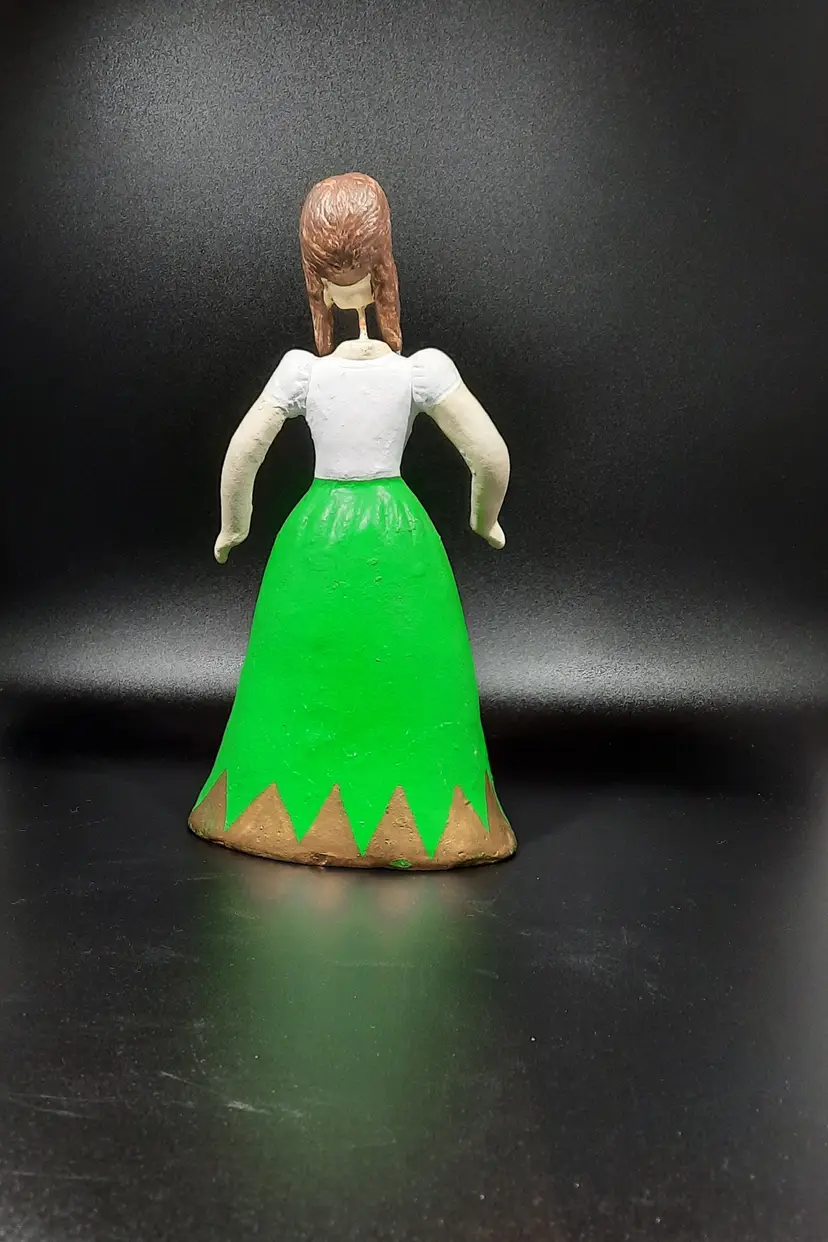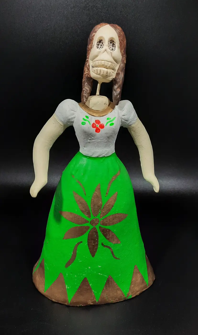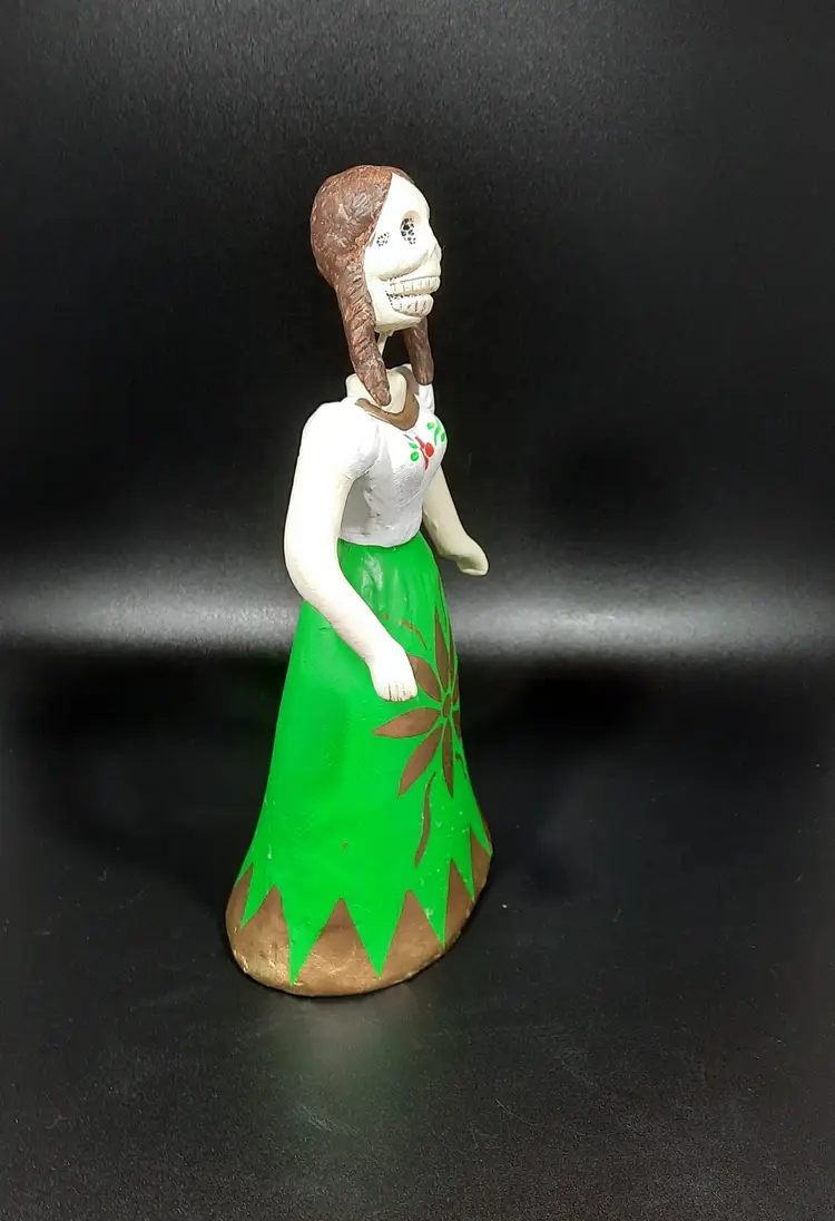 This figurine is a Mexican handmade pottery folk art woman. She stands approximately 9 inches tall. Her dress is decorated with painted motifs that glow under UV light. She is in good pre-owned condition and has no chips or cracks.