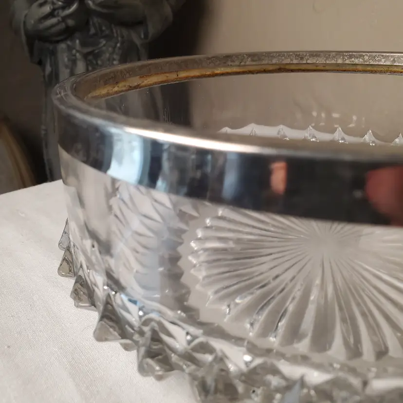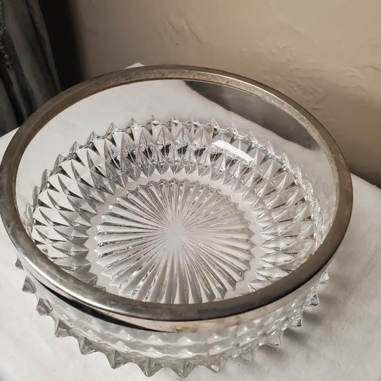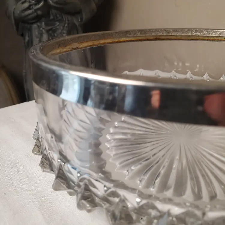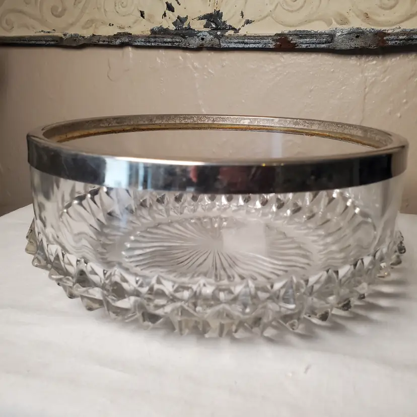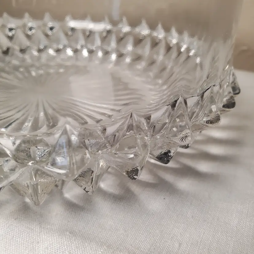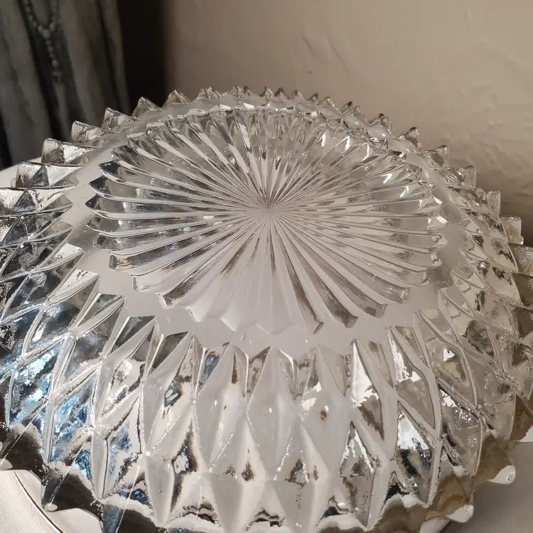 Gorgeous heavy diamond cut glass bowl that is perfect for displaying anything from fruit to holiday ornaments. 7 3/4" diameter. 3 1/4" tall. No chips or cracks.