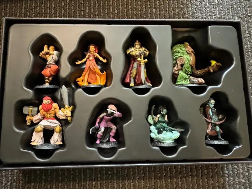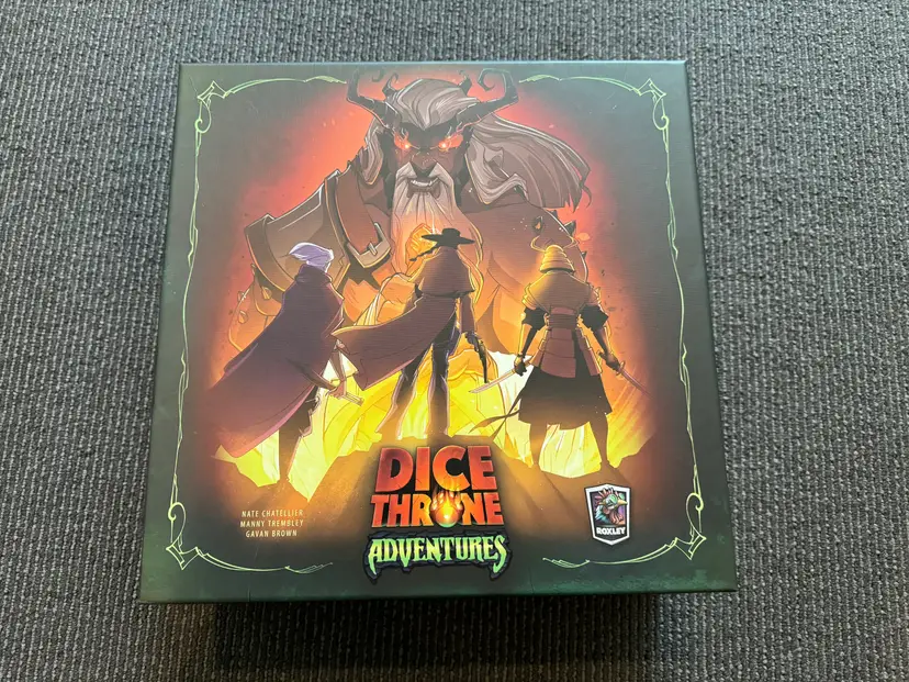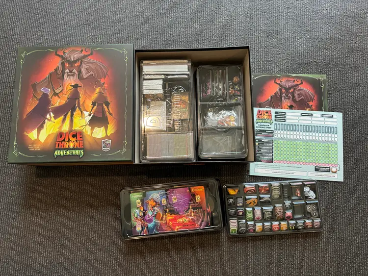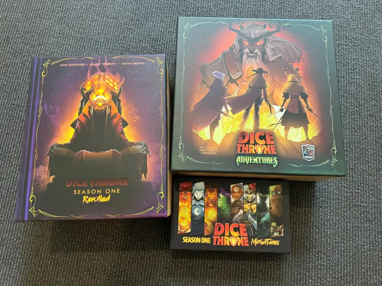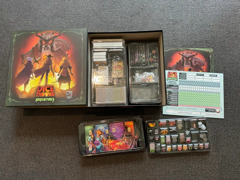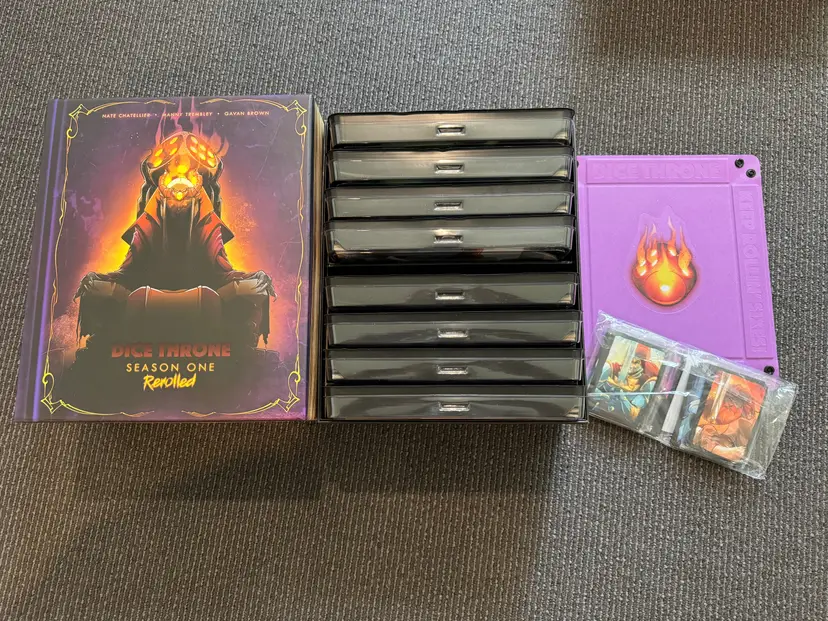 An incredible bundle of Dice Throne - Season 1 Rerolled Battle Chest (excellent condition, cards sleeved) + Dice Throne Adventures (unused, card decks sealed) + Painted minis from Roxley (painted at the factory) + Dice Throne Dice Tray