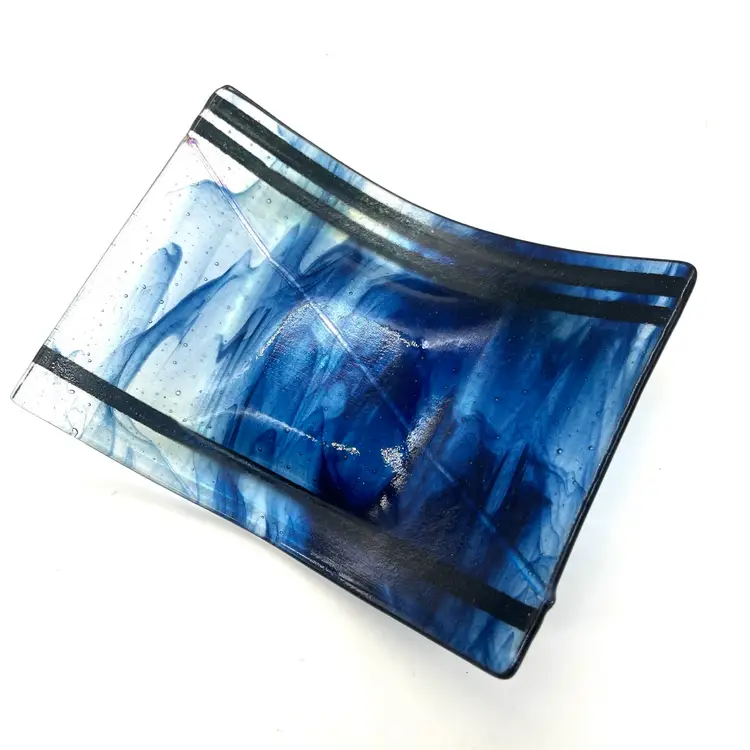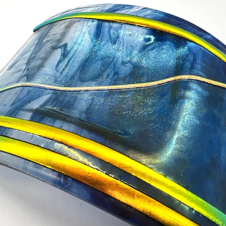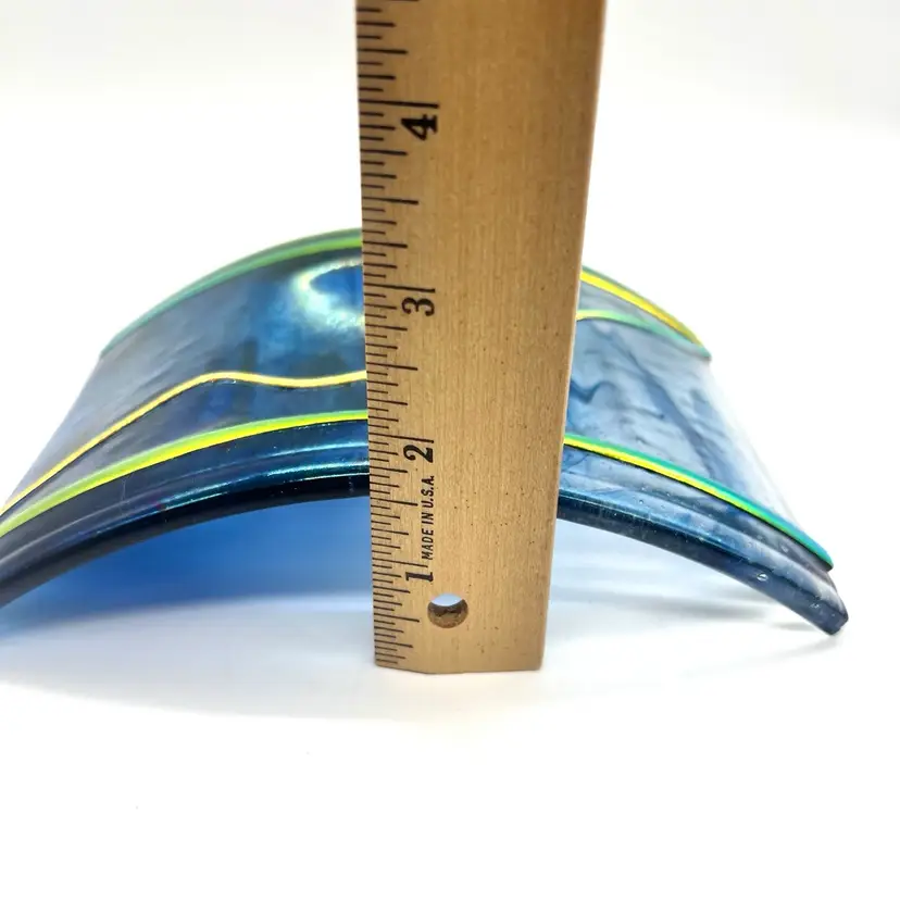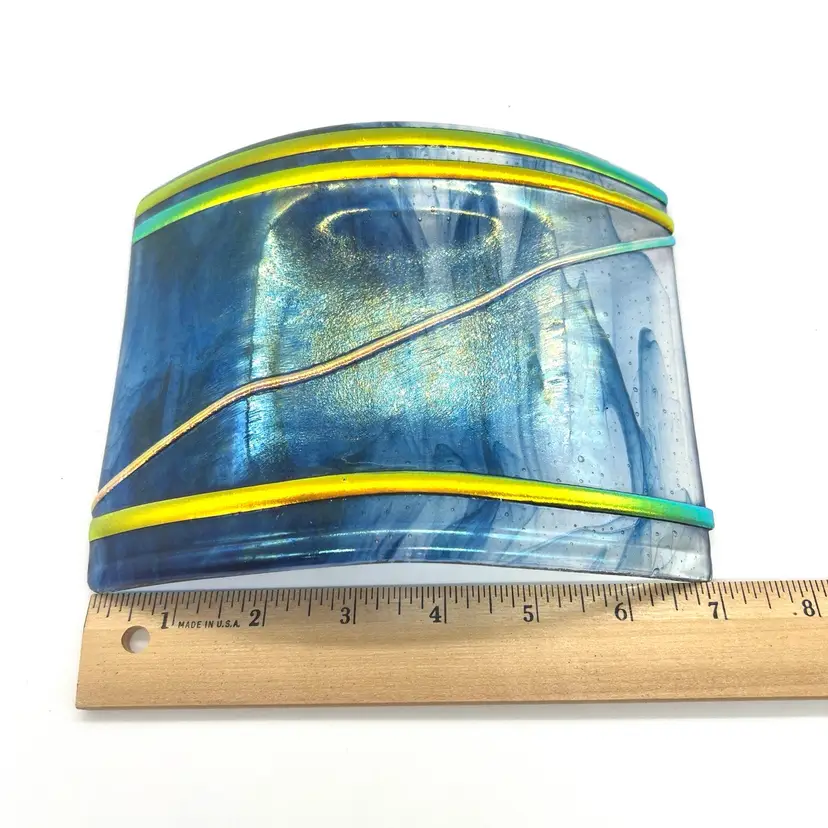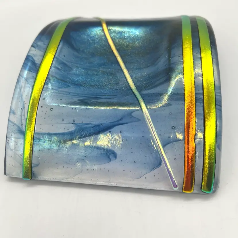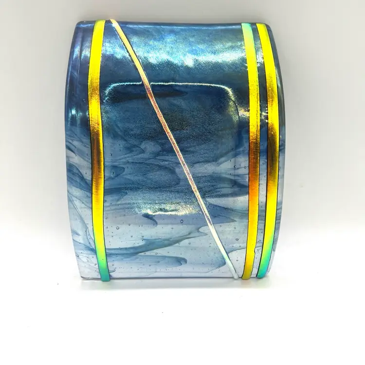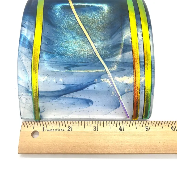 Beautiful hand made dichroic glass candle holder in bridge form. The base color is blue and the accents are a gold with some green and orange shift to it. The size is L 7” W 5” H 1 3/4” No chips or cracks No signature I can see.
