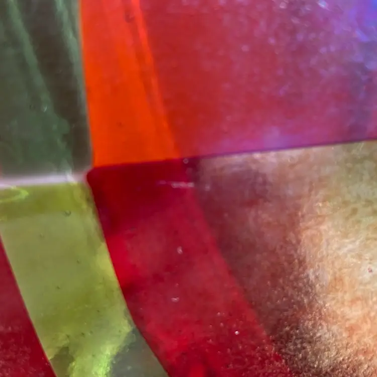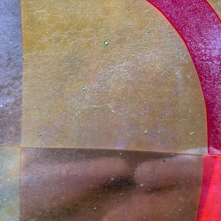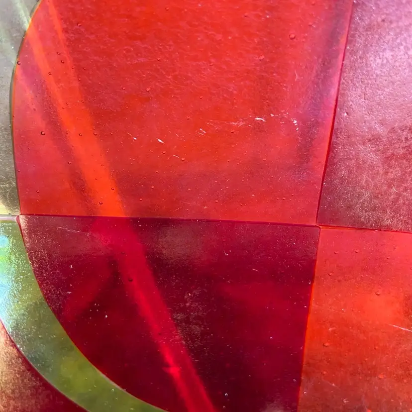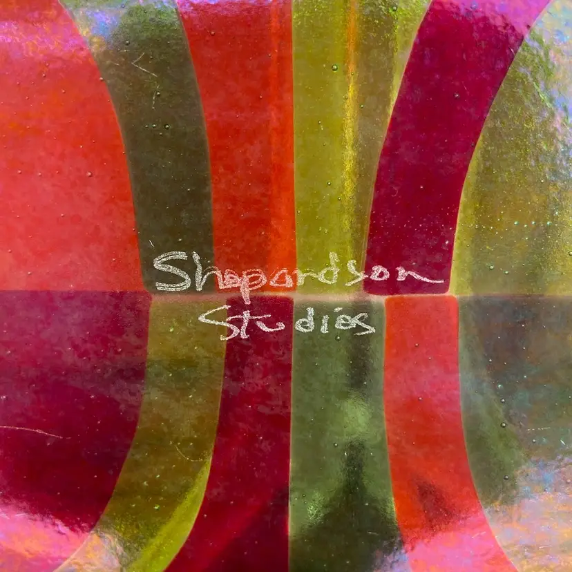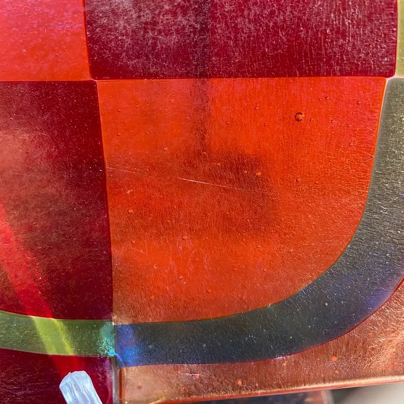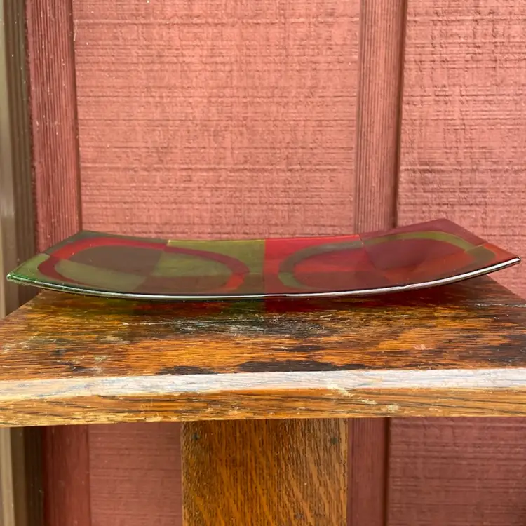Approx 12”w x 6.5”d x 1”h. Preowned condition. No chips or cracks. Bubbles throughout piece. See images as part of description, specifically 5-9 for scratches.