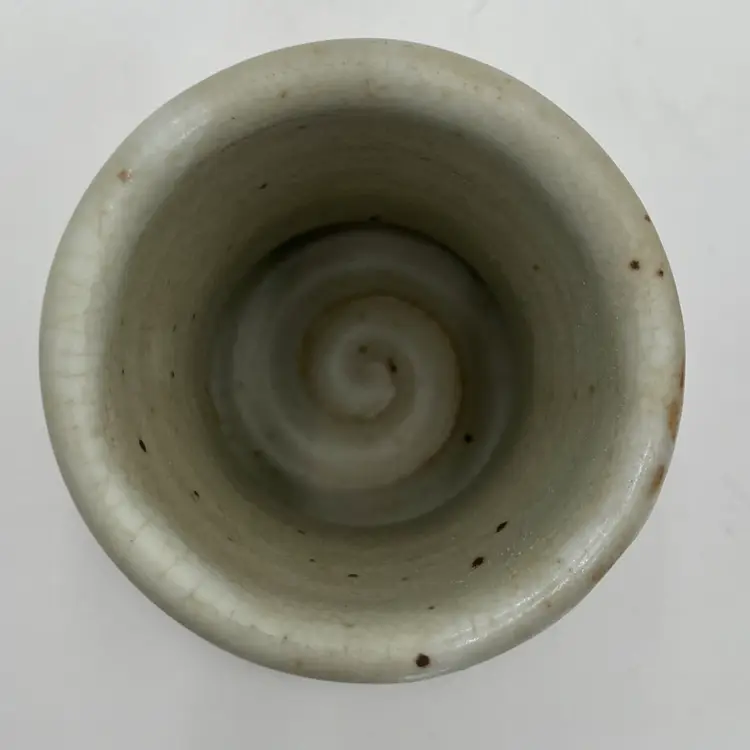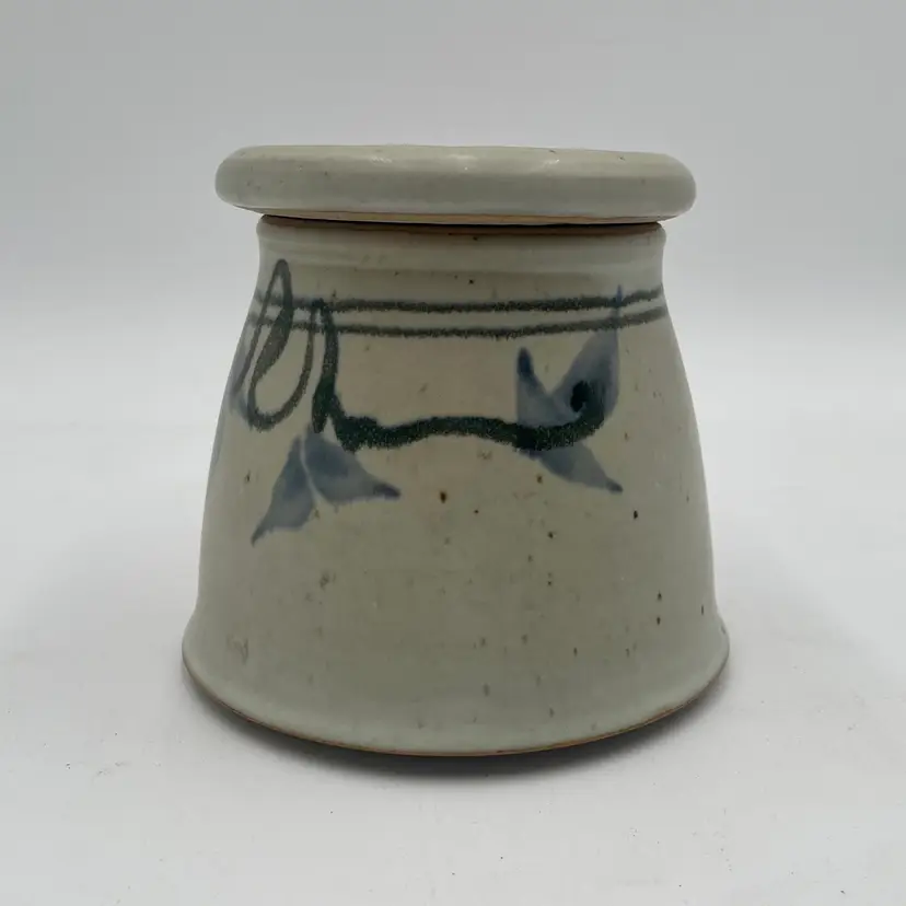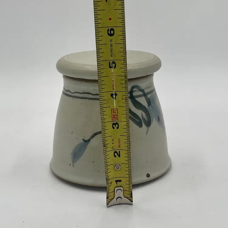 Gorgeous stoneware pottery bell decorated in a floral motif and stamped Dick Lehman, Goshen Indiana. The butter bell measures almost 5" tall and holds about 4oz of butter in the lid.