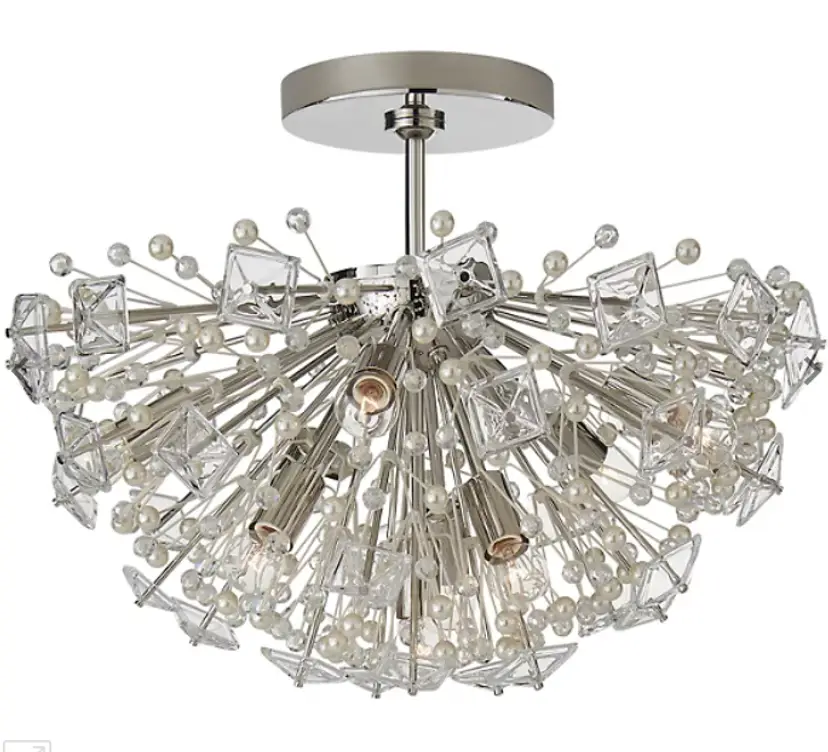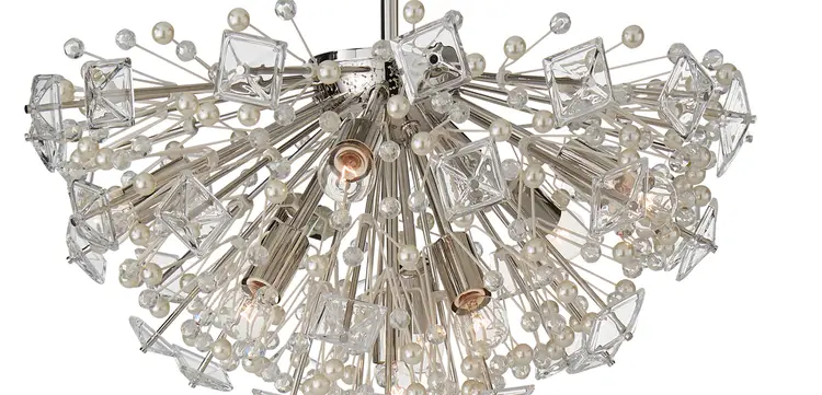 The Dickinson Semi-Flush mount by Visual Comfort Signature, formerly known as Visual Comfort, is a gorgeously glittering galaxy that recalls the gilded aesthetics of the Roaring Twenties. An explosion of Clear Glass and Cream pearls creates a glistening garnish to any ceiling. Let the Dickinson Semi-Flush mount takes you back to the Jazz Age with its Art Deco decadence.