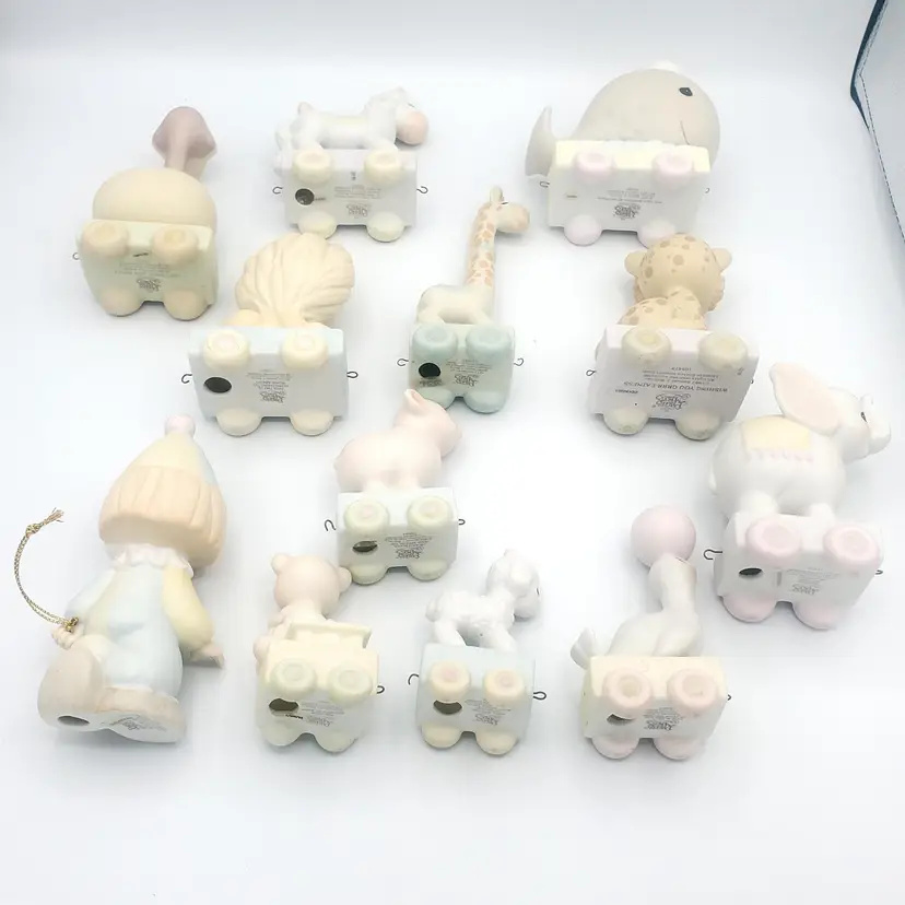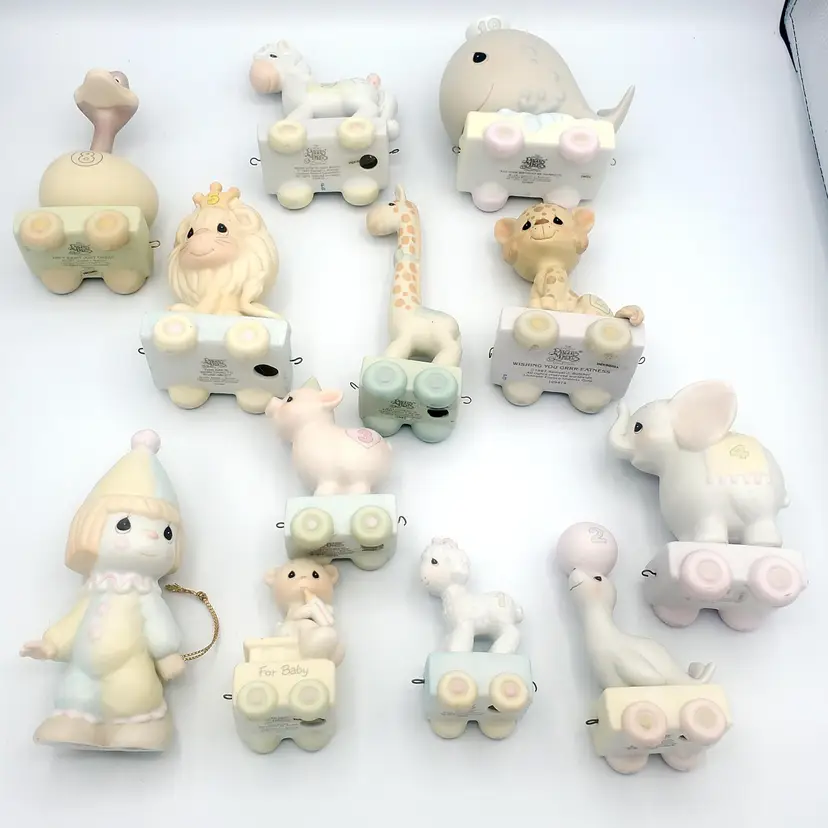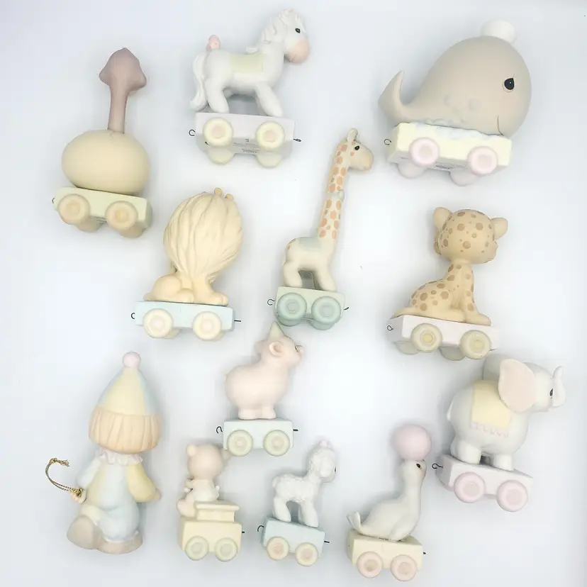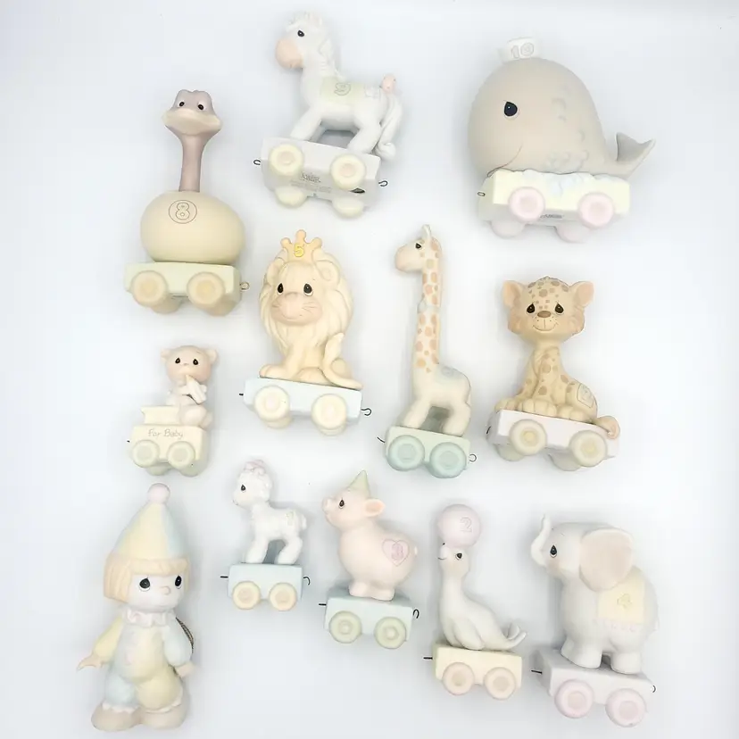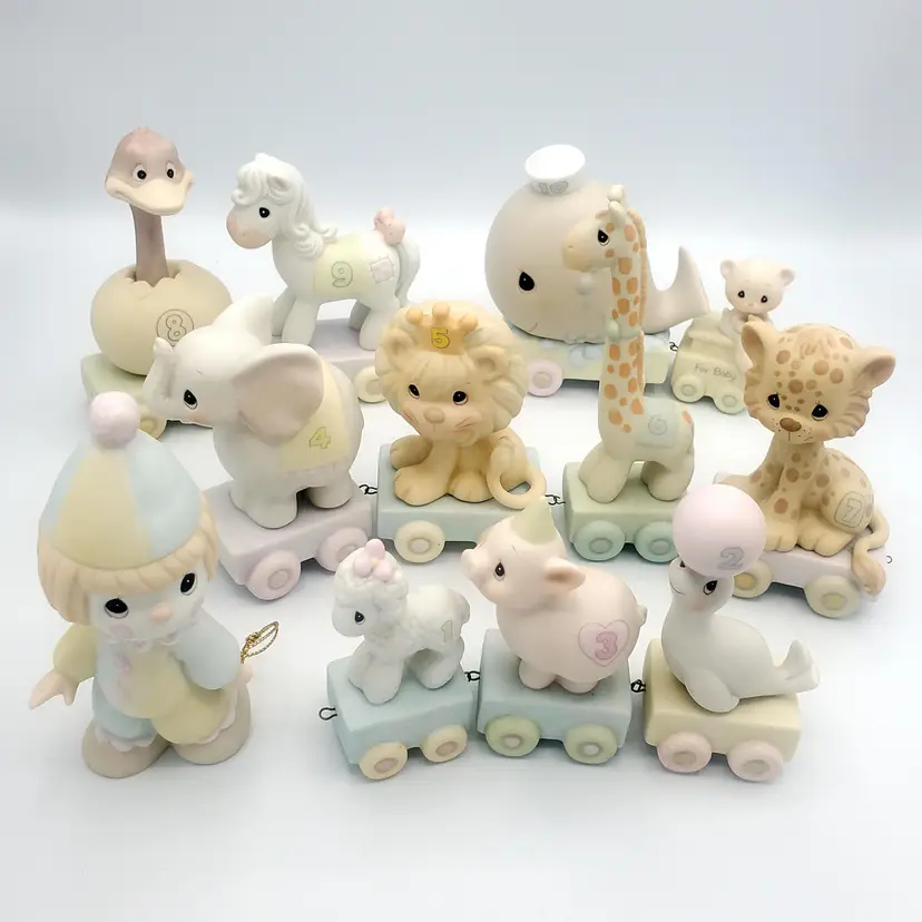 I may have taken the brief too literally. :) This adorable 12-piece Precious Moments animal train set features a variety of cute animals (Birthday 1-10 + Baby!) and a clown conductor, all in soft pastel colors. Each piece is in excellent condition with no chips or cracks. Perfect for collectors or as a charming decoration for a nursery. Thanks for looking!
