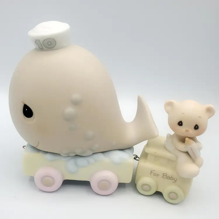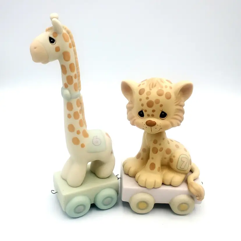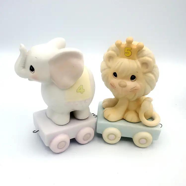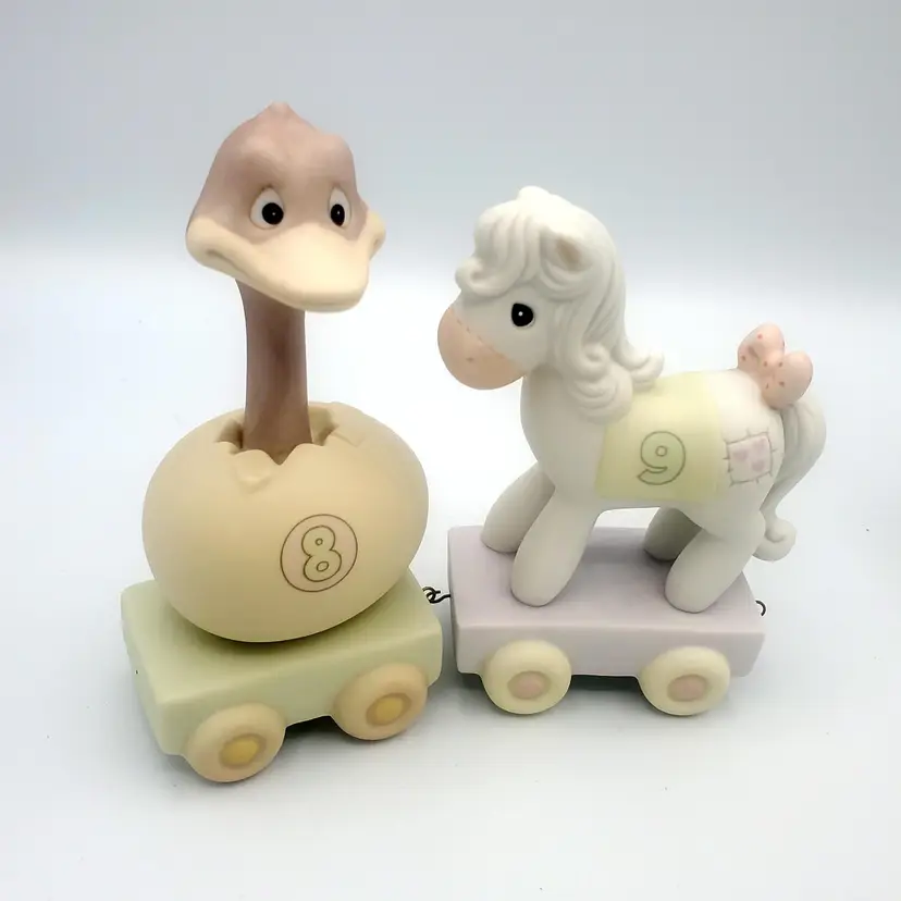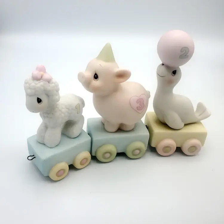 I may have taken the brief too literally. :) This adorable 12-piece Precious Moments animal train set features a variety of cute animals (Birthday 1-10 + Baby!) and a clown conductor, all in soft pastel colors. Each piece is in excellent condition with no chips or cracks. Perfect for collectors or as a charming decoration for a nursery. Thanks for looking!