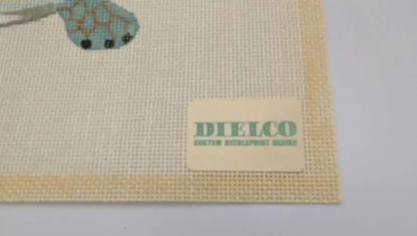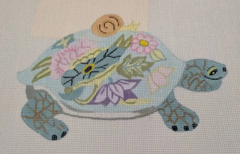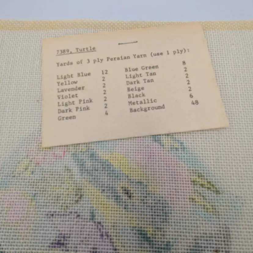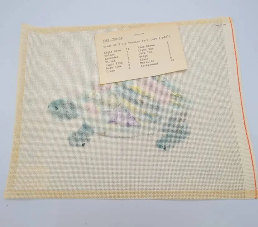 This is a printed needlepoint pattern of a Turtle and a snail. It is by the company Dielco- a name known for its custom needlepoint designs. The backside has the information on the color and amount of Persian yarn needed. Does not include the thread. This is on strong mesh fabric. I believe it is 18 mesh.
