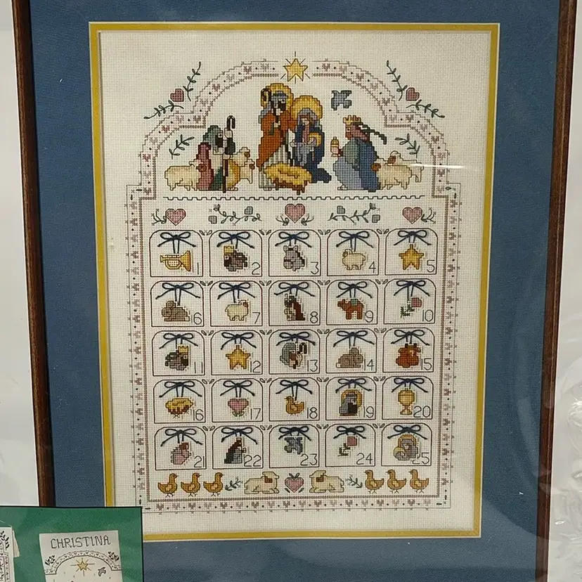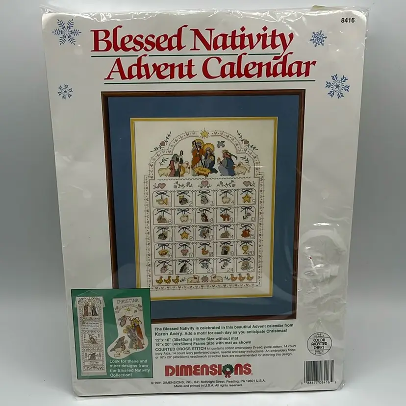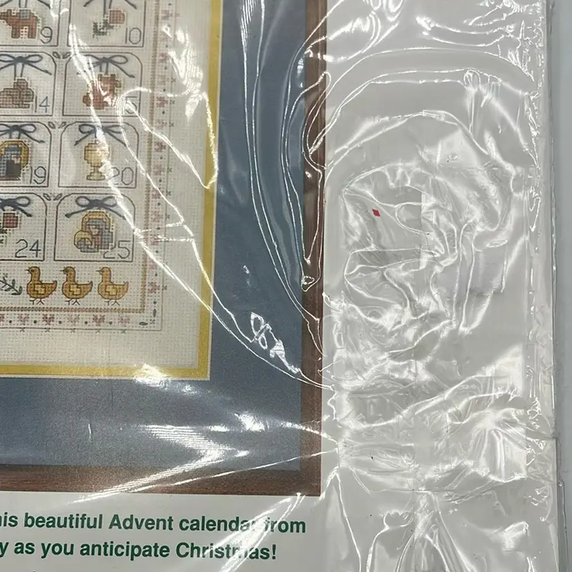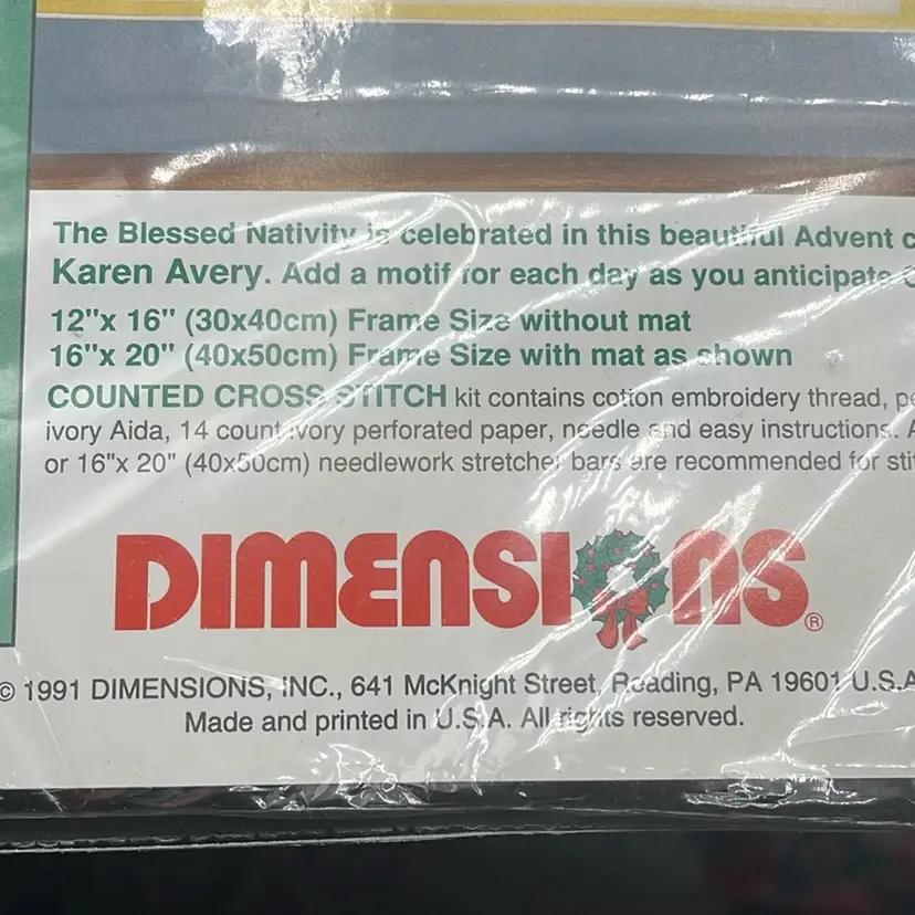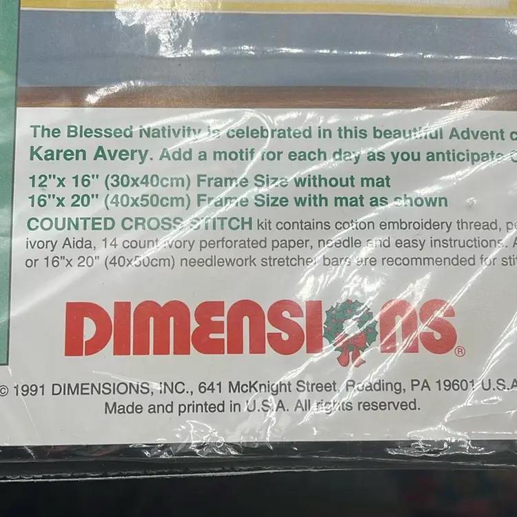 12 x 16” finished. Does not include frame. A little rip on plastic in front taped.